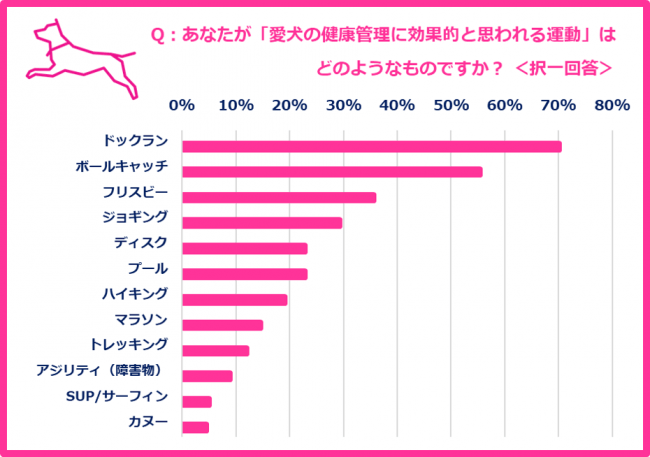 さらに愛犬の健康管理方法として「散歩以外の運動」と回答した人に、「愛犬の健康管理に効果的と思われる運動」について聞いてみたところ、以下の通り、「ドックラン」、「ボールキャッチ」、「フリスビー」、「ジョギング」、「ディスク」等、“走る”ことが基本となっている運動が上位を占めました。“愛犬が好きな運動”についても、同様の結果となっています。