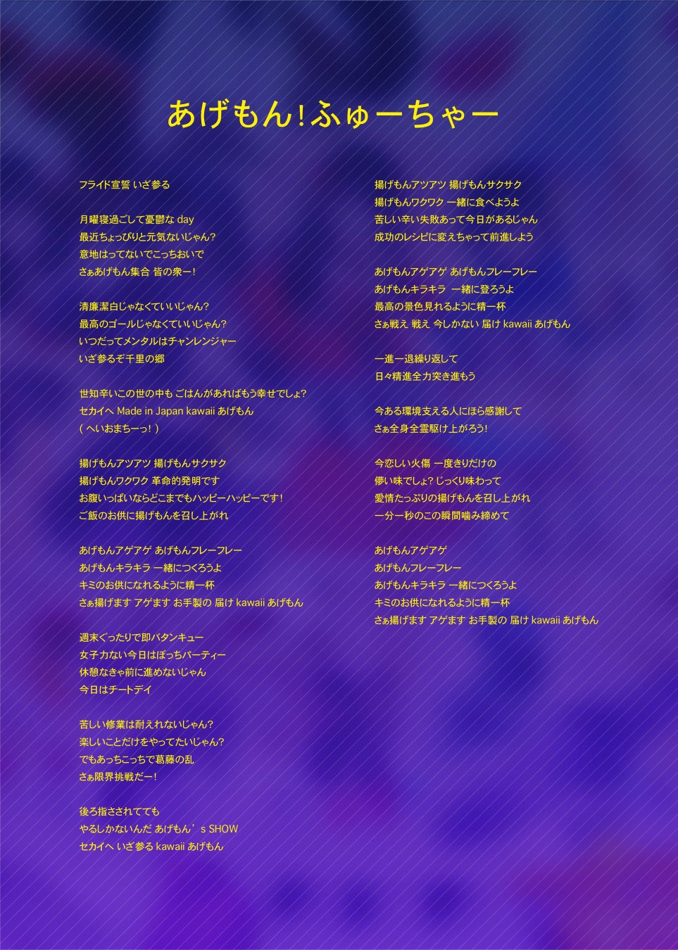 同曲は、ジュワジュワと唐揚げが揚がるような音と和風なイントロから始まり、ポップでつい口ずさみたくなってしまうリズミカルな楽曲。要所要所で出てくる揚げ物ワードが癖になり、楽曲の終わりにはサクサクの唐揚げを食べたかのような音が入っていて遊び心に溢れる、楽しい応援ソングになっている。