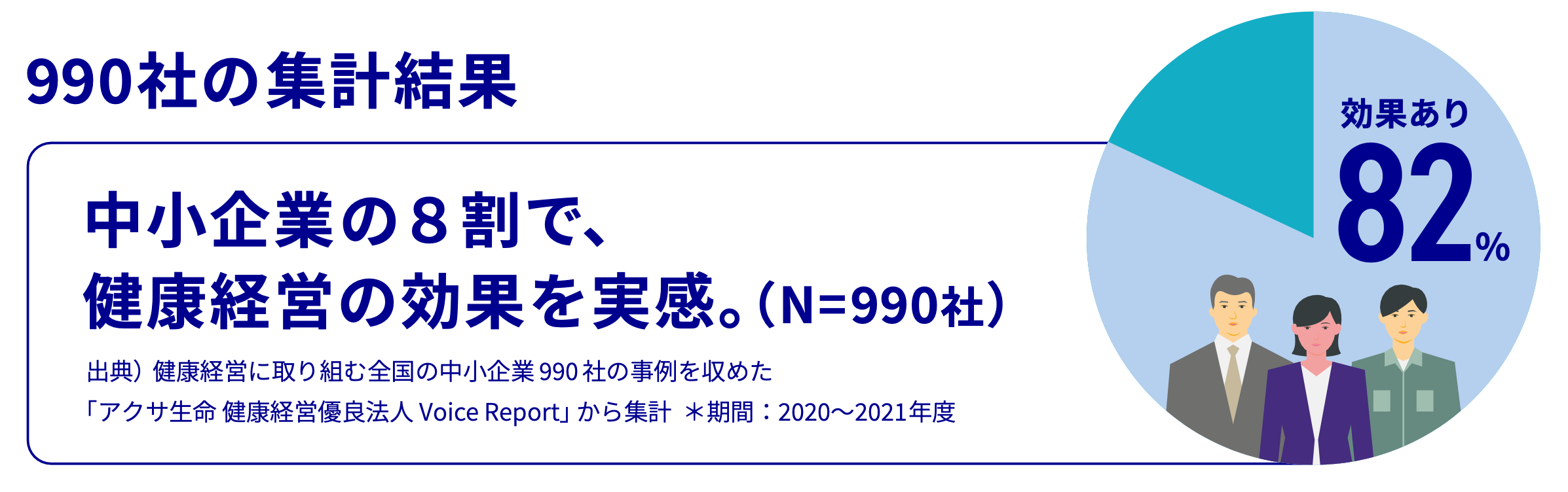 中小企業990社による健康経営の取組事例を収めた当社「Voice Report」の集計結果では、82%の中小企業が健康経営の効果を実感しています。この傾向値に基づき、導入企業が実感した効果の累積が、今後の日本の様々な社会的課題の解決にどのようにつながるかという観点でその可能性を推計しました。