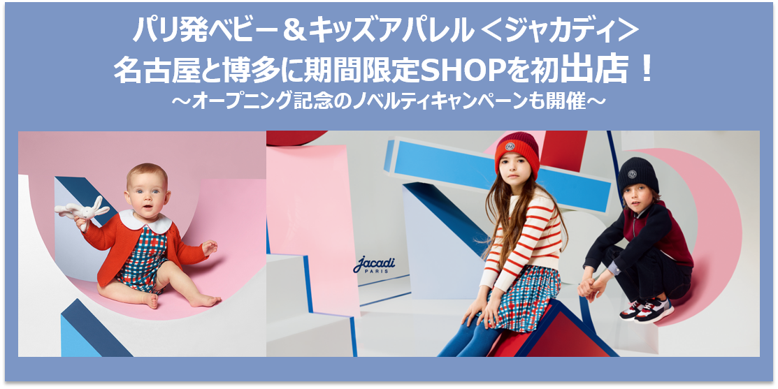 コーンズ・アンド・カンパニー・リミテッド(所在地:東京都港区、代表取締役社長:渡 謙作)が展開する、パリ生まれのキッズ&ベビーアパレルブランド「ジャカディ」は2020年9月、名古屋と博多に期間限定SHOPをオープンします。