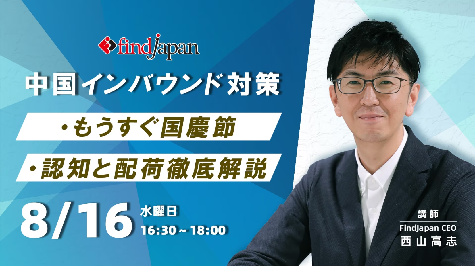 中国政府より発表された団体旅行解禁のニュースは、インバウンド・越境EC業界において大きな意義を持つものであり、他国と比べて訪日客数の回復が遅れる中国の今後の動向が注目を集めると同時に、これによって回復が見込まれる中国人訪日客をターゲットとして、日本企業の対中国マーケティング活動の活発化が想定されます。この状況を受けて、FindJapan株式会社は、以下の通り緊急セミナーを開催いたします。