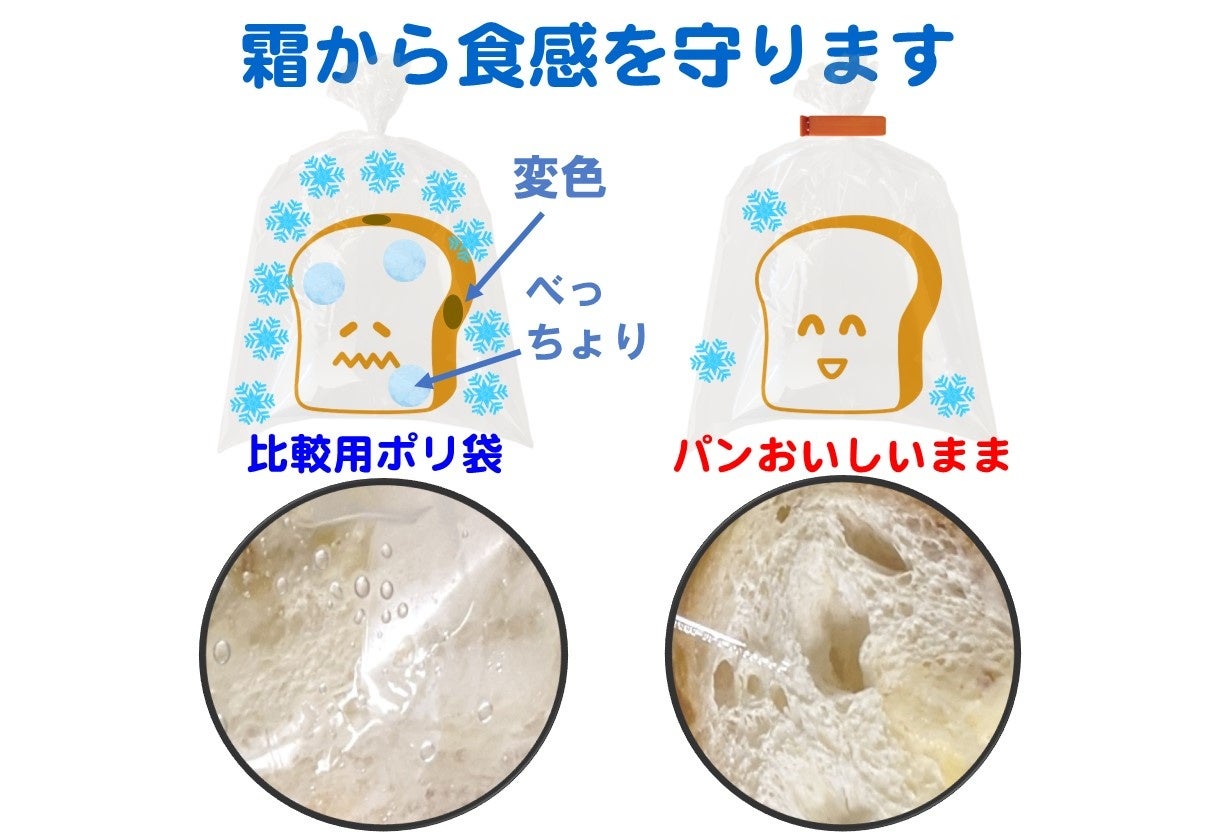 1.「高保香性」 2.「酸化防止」 3.「霜の防止」の3つの効果により、冷凍パンの品質と美味しさをしっかりキープ。さらに、冷凍庫内のにおい移りも防ぎます。