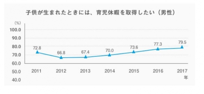 また、産後の妻の死因の一位は自殺(国立成育医療研究センター調査より 添付1参照)です。孤独な育児と睡眠不足による「産後うつ」が要因であると言われており、男性の育児休業取得の促進が急務となっています。さらに、男性新入社員の約8割が「子どもが生まれたときには、育休を取得したい」と考えている(2017年日本生産性本部「新入社員意識調査」より 添付2参照)ことから、社員のワークモチベーション向上、離職防止、キャリア人財獲得にも、大きな効果が期待されています。