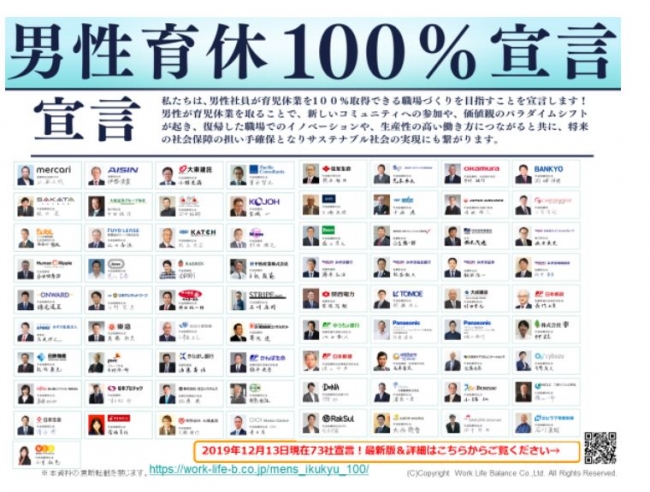 そこで当社では、男性の育児休業取得率100%の実現に向けて、企業の経営者が宣言し、目標をもってアクション及び発信していく「男性育休100%宣言」プロジェクトを今年3月より始動しました。またテレビ局や建設業、医療、国会議員など各界の経営トップ140名が参加したシンポジウムを開催するなど、官民で連携した取り組みも図っています。「男性育休100%宣言」には、2019年12月時点ですでに73社が参加しています。(添付3参照)