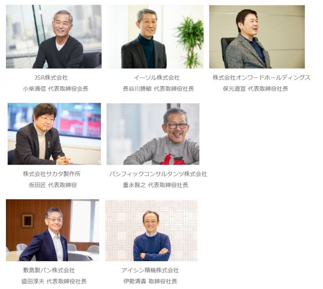 2019年12月27日(金) | 株式会社サカタ製作所 坂田匠 代表取締役 敷島製パン株式会社 盛田淳夫 代表取締役社長 イ―ソル株式会社 長谷川勝敏 代表取締役社長 パシフィックコンサルタンツ株式会社 重永智之 代表取締役社長 JSR株式会社 小柴満信 代表取締役会長 株式会社オンワードホールディングス 保元道宣 代表取締役社長 アイシン精機株式会社 伊勢清貴 取締役社長 |