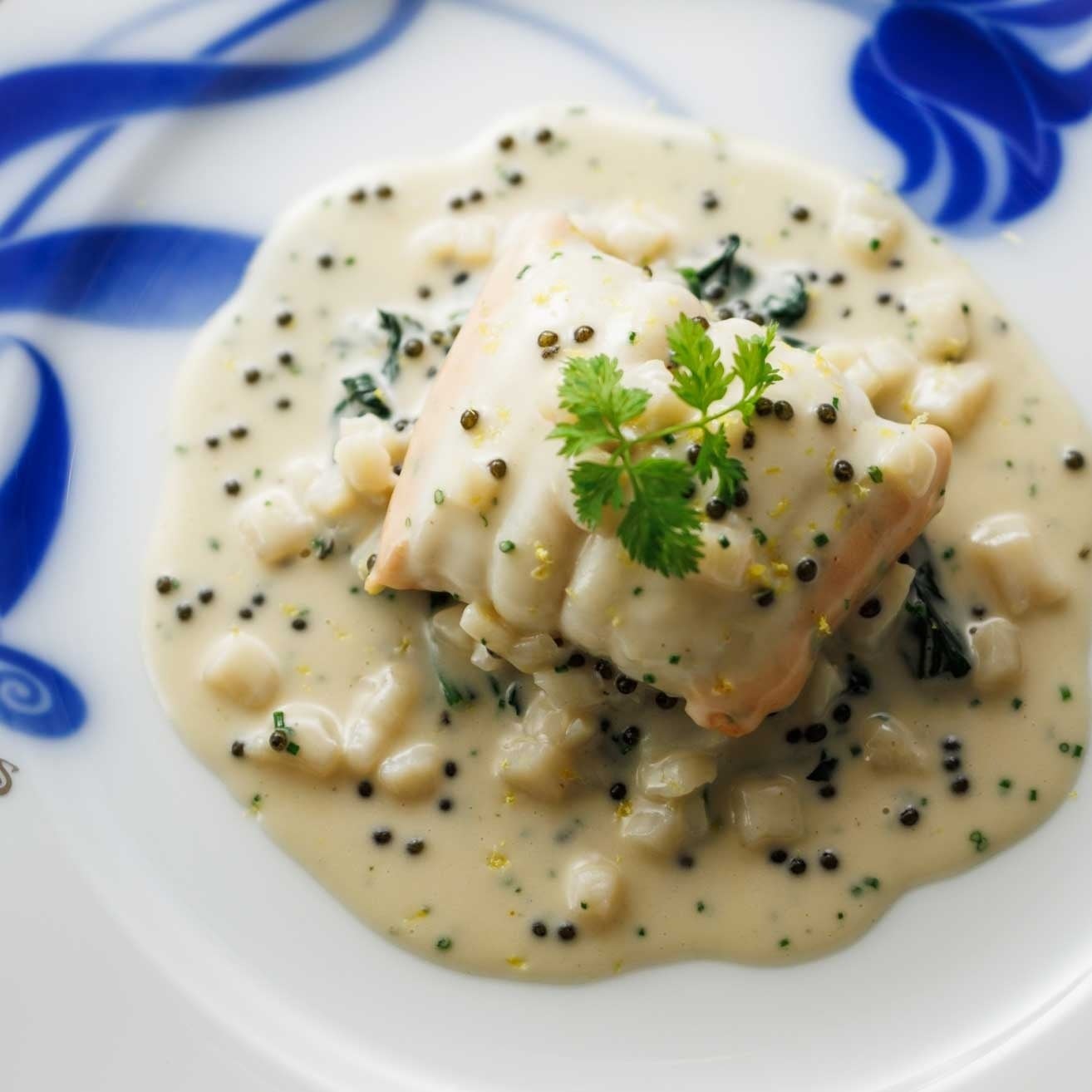 ドーバーソールの白ワイン蒸しシャンパーニュ風味 宮崎キャビア入りクリームソースレモンの香り(単品 12,100円:税込・サービス料別 / Sサイズ 9,900円:税込または40,700円:税込・サービス料別のコースの魚料理として)