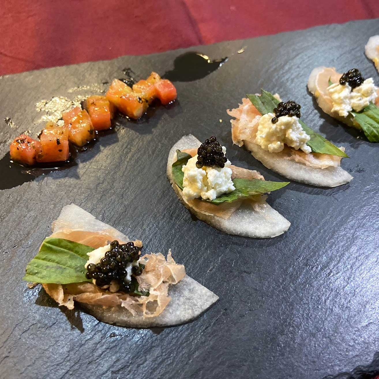 戻りガツオとジャパンキャビア『オシェトラプレミアム』ラヴィゴットソース(炭火であぶった戻りガツオにキャビアをのせて酸味のきいたラヴィゴットソースでスモークの香りとともにお召し上がりいただきます。コース内のアミューズとしてキャンペーン期間中のみ販売します。)