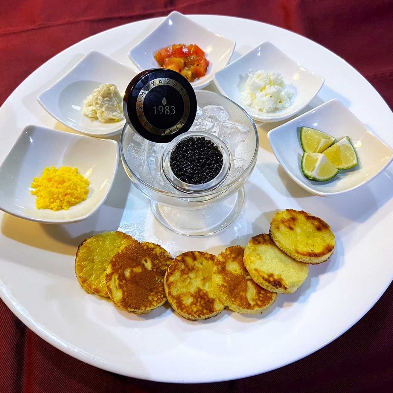 国産オシェトラキャビア『ジャパンキャビア オシェトラプレミアム』ブリニトーストとコンディマンとともに(クラシックスタイルでブリニトーストと薬味をそえてキャビアを味わっていただく料理です。アラカルトメニューとしてキャンペーン期間内特別価格で販売します。)