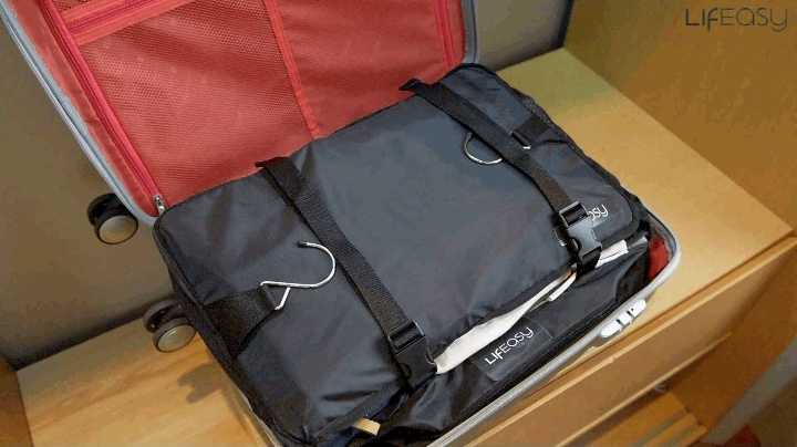出張やご家族全員での旅行先で、スーツケースからこのアコーディオンポーチを取り出し、ホテルのクローゼットに掛けるだけ!