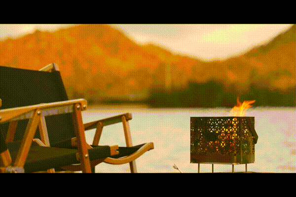 女性や子供でも片手で持ち運べる手軽なサイズと重量ながらも、調理器具を乗せて調理もできる強度と、シーンに応じて柔軟に姿を変える多機能焚き火台です。火を灯すと本体のデザインが幻想的に浮かび上がります。