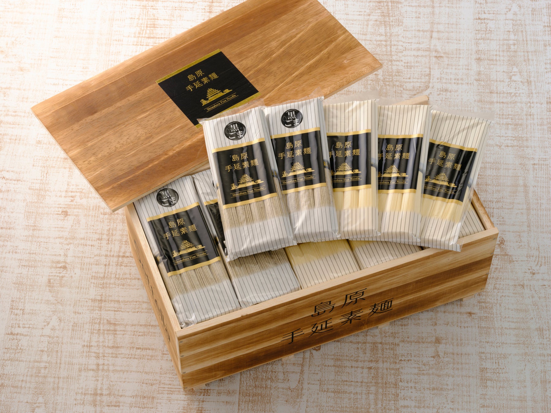 その「島原手延べ 黒ごまそうめん」から、お中元や暑中お見舞いといった夏ギフトはもちろん、この夏、キャンプに差し入れたら盛り上がること間違いなしの特製木箱詰合せ(島原手延べそうめん4束×24袋、島原手延べ 黒ごまそうめん4束×16袋 税込み14,040円)が発売します。