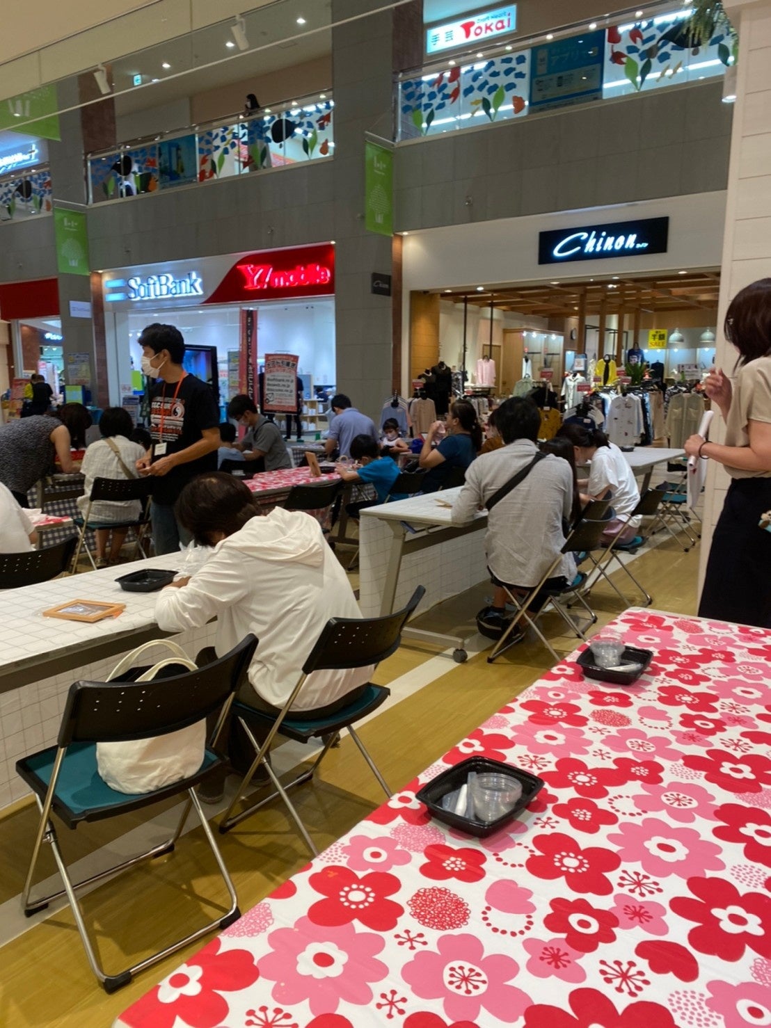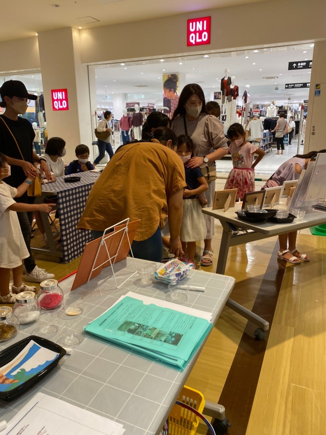 大型ショッピングモールや商業施設、ホテルや百貨店などでは、「リサイクルガラスアート体験イベント」を実施し、このリサイクル活動に多くの方が参加しています。どこでも大変人気が高く、どこでも長蛇の列ができるほど、多くの子供たちが「もっとやりたい」「楽しい」と言われている学び型イベントです。
