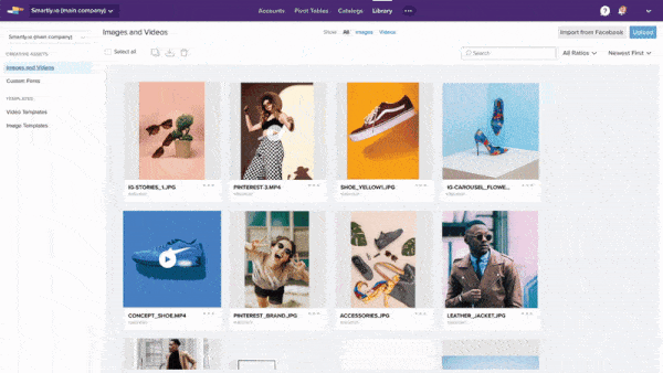 Smartly.io 管理画面で提供される Asset Library は、マーケティングチームやクリエイティブチームが、複数のソーシャルチャネルを横断してアセットを保存・整理・活用することを可能にします。