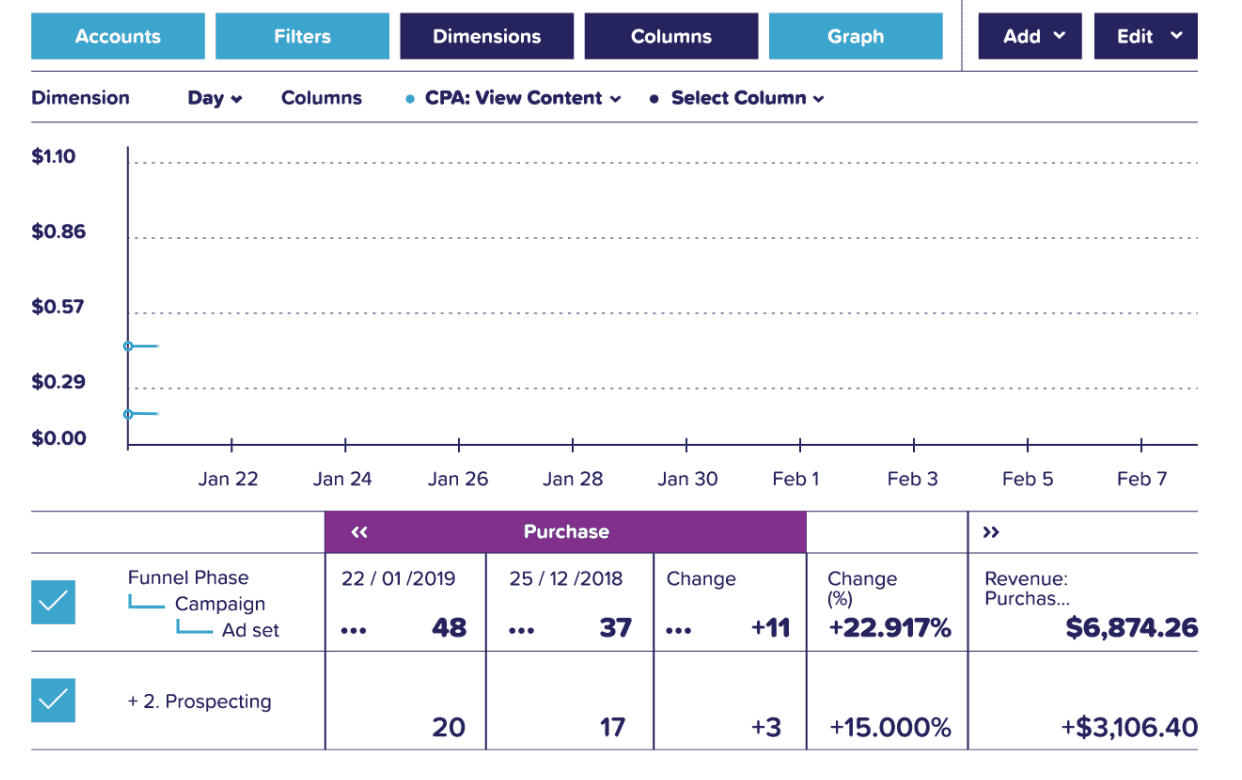 Smartly.io のレポーティング機能により、キャンペーンのパフォーマンスを詳細なレベルで確認することができ、どの広告・クリエイティブ・商品が最も良いパフォーマンスを発揮しているかをピンポイントで把握することができます。