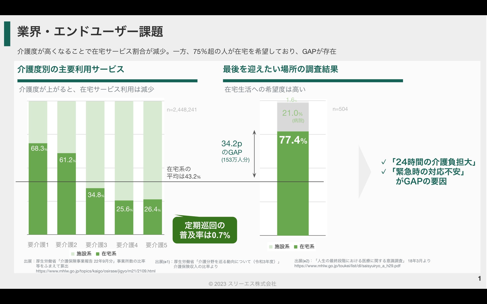 しかしながら現状においては、施設サービス/訪問介護/デイサービスの各市場は10年で+40%超の成長を示すのに対して、在宅介護の重要な提供サービスのひとつである「定期巡回」については、介護保険総費用のうち0.7%(※1)にとどまっています。
