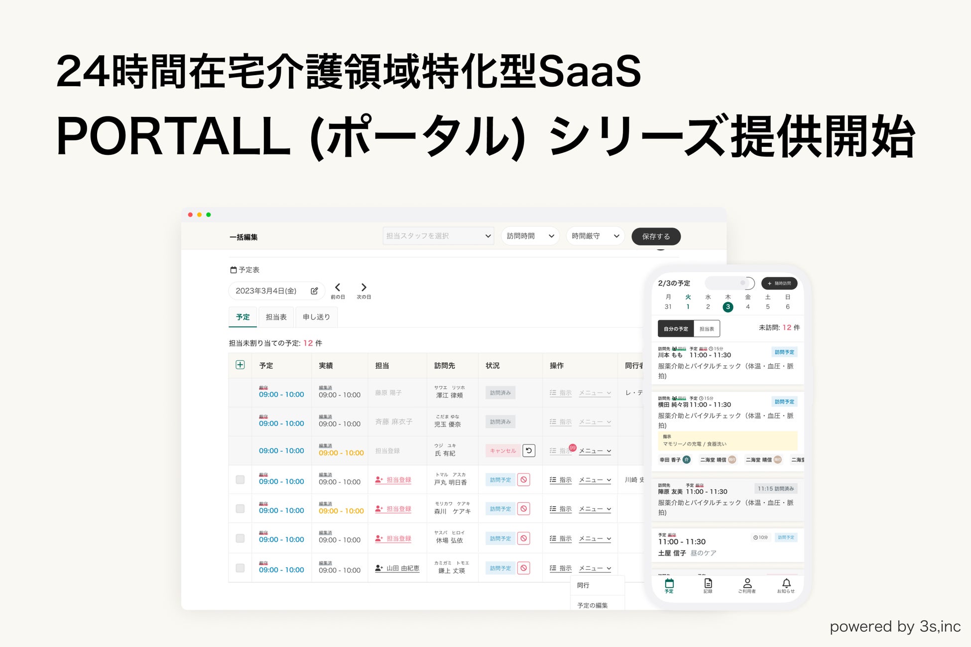 24時間在宅介護領域特化型SaaSを開発するスリーエス、在宅介護における定期巡回マネジメントを支援する「PORTALL(ポータル)」シリーズの提供を開始