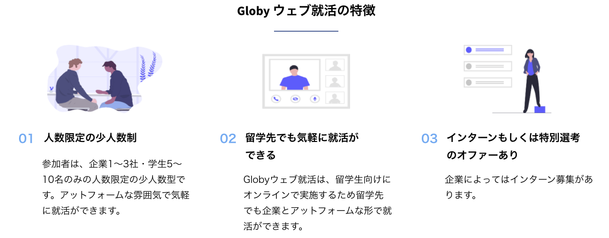 Globyウェブ就活は留学出発前や留学中、帰国後の日本人留学経験者向けのウェブ就活サービスです。