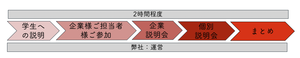 1回のイベントは、企業1から3社。学生は5名から10名と少人数で実施します。アットホームな雰囲気で気軽に就活ができます。