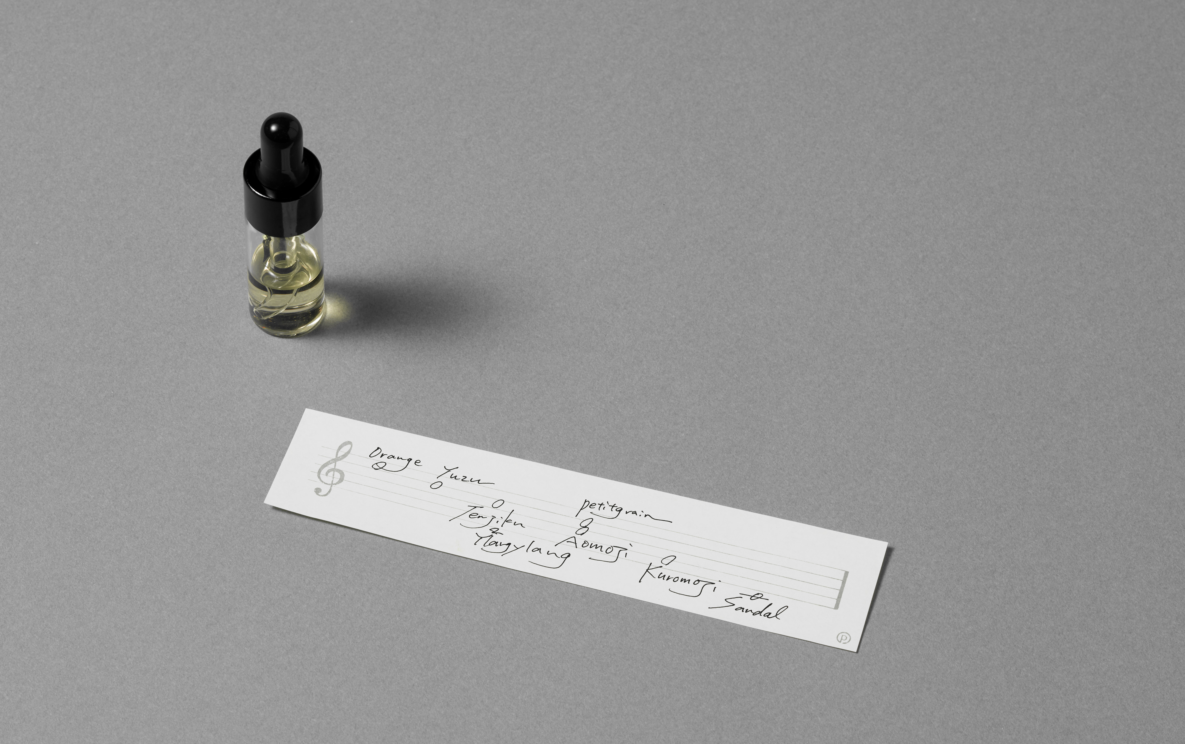 日本で古くから親しまれてきたクロモジ、ハレとケの場面で重宝されたユズ、精神統一の意味をもつビャクダンの3つをキーノートに、それぞれにストーリーを持つ天然精油を8種配合。はじめはオレンジ、ユズの柑橘が高く華やかに鳴り、次第にアオモジやクロモジの安定した音階へと流れ、ビャクダンに落ち着きます