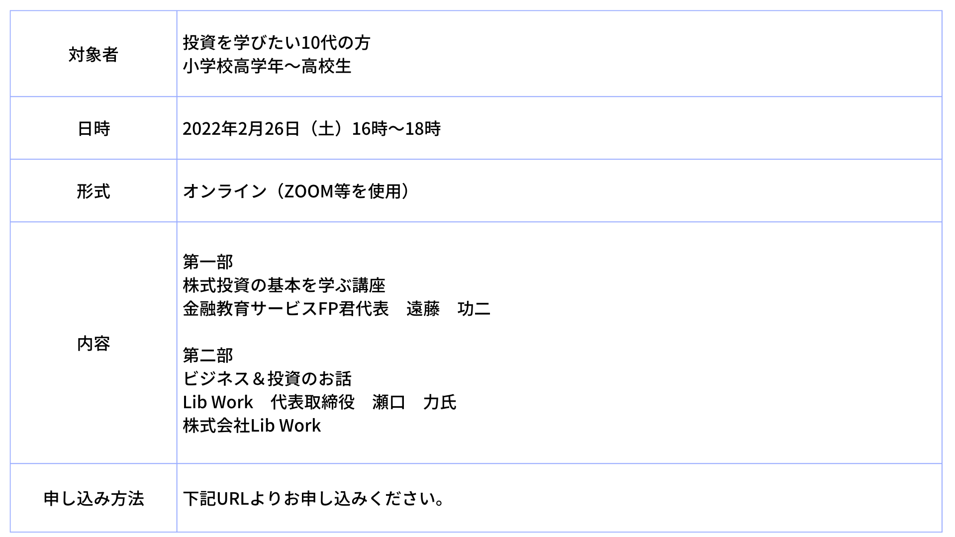 10代のための「上場企業の社長に学ぶ株式投資セミナー」開催のお知らせ(2022年2月26日(土)16時〜18時開催)