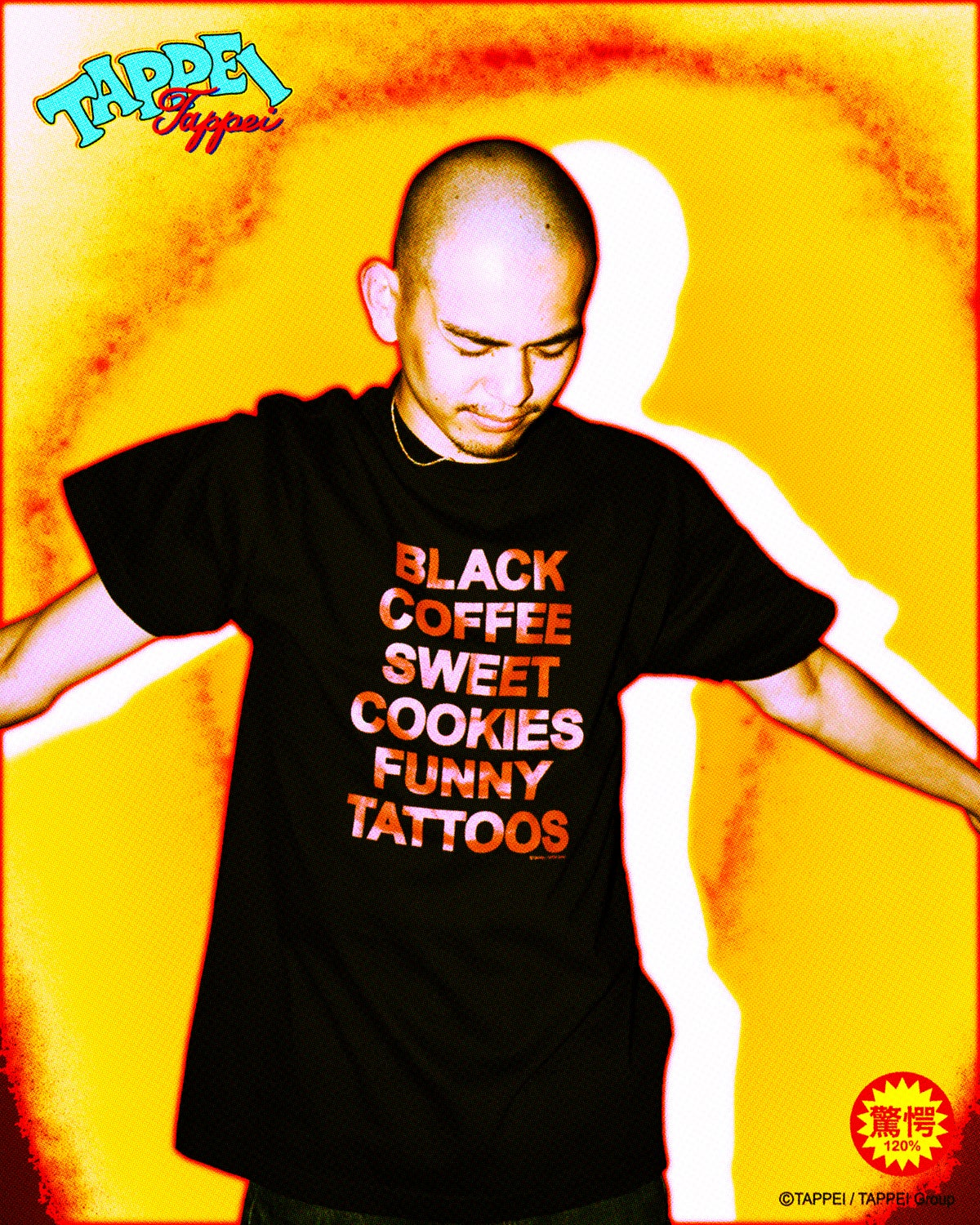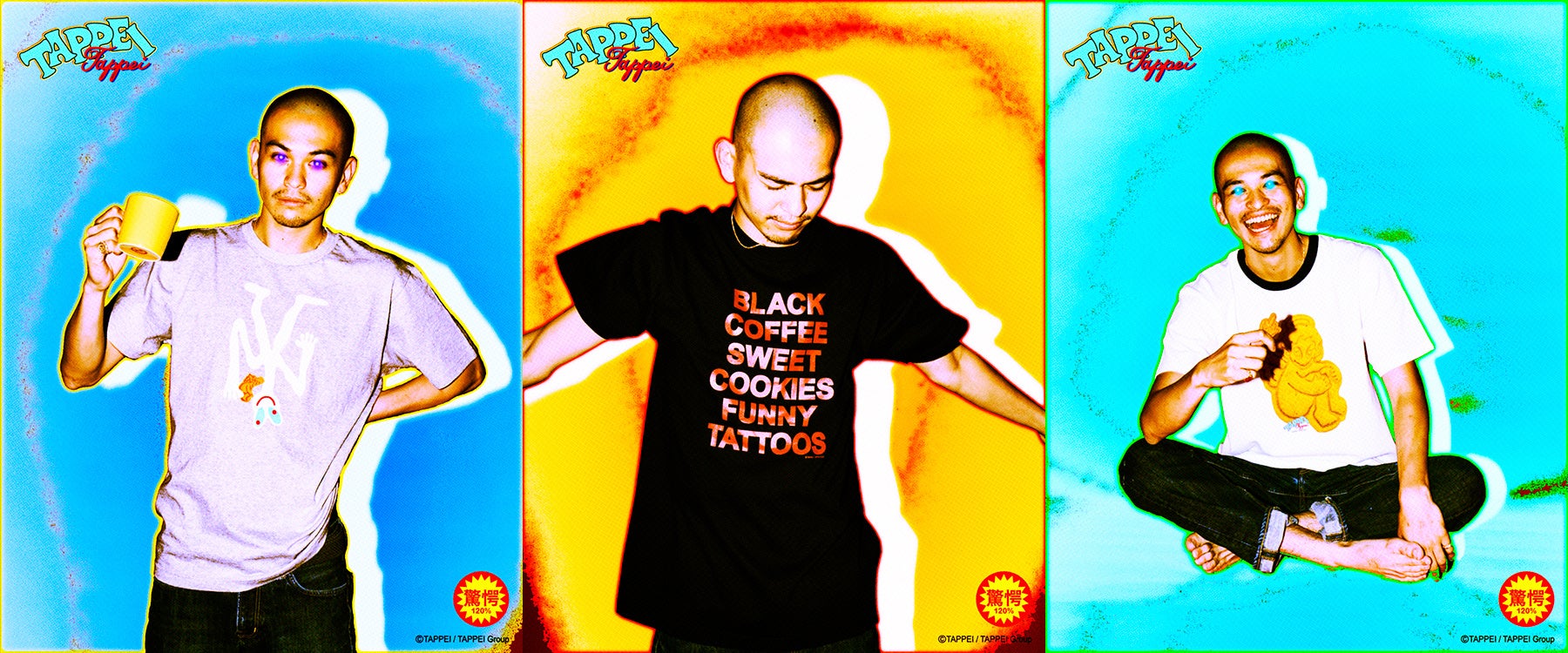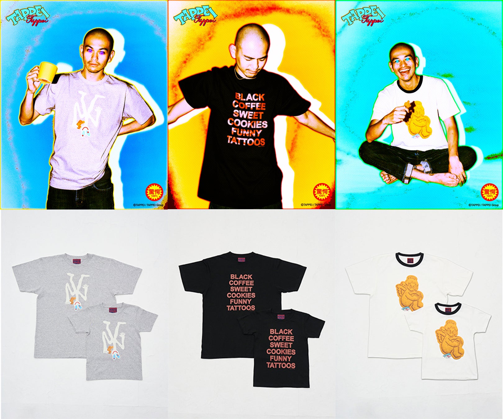 バター風味のオリジナルクッキーは、TAPPEIのメインモチーフ「天使のキャラ」や、タトゥーモチーフのデザインをかたどり、クッキー8枚とステッカー1枚のセット(2970円)で販売。コーヒー(1650円)は、秋田のKEIJYUKU COFFEEとタッグを組み、クッキーとの最高の相性を実現するため、柑橘系の香りとジューシーさを加えたビターチョコレートのような重厚な苦みと甘みを感じるように仕上げた。クッキーとコーヒーの販売開始にあわせてオリジナルデザインのTシャツ3種(130・150:5500円、M〜XL:6600円)を展開する。