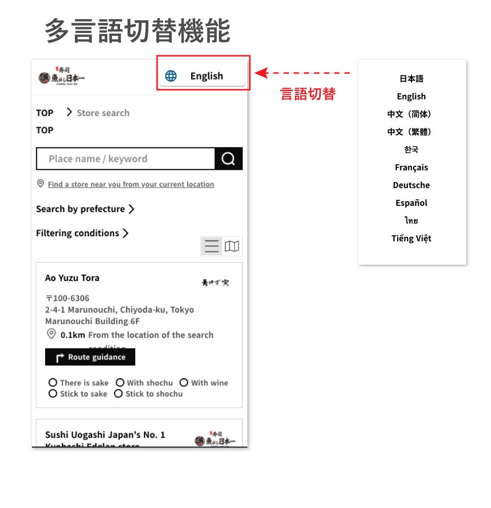 多言語切替機能は「店舗検索サービス」において店舗情報を日本語から9言語に切り替えることができます。当機能は訪日外国人客だけでなく、日本語以外の情報発信を求める消費者の声を多くいただき、また無料の翻訳サービスでは日本語を正確に翻訳できない部分があったため、機能開発を行いました。これにより、消費者に正確に店舗情報を発信することができるようになります。