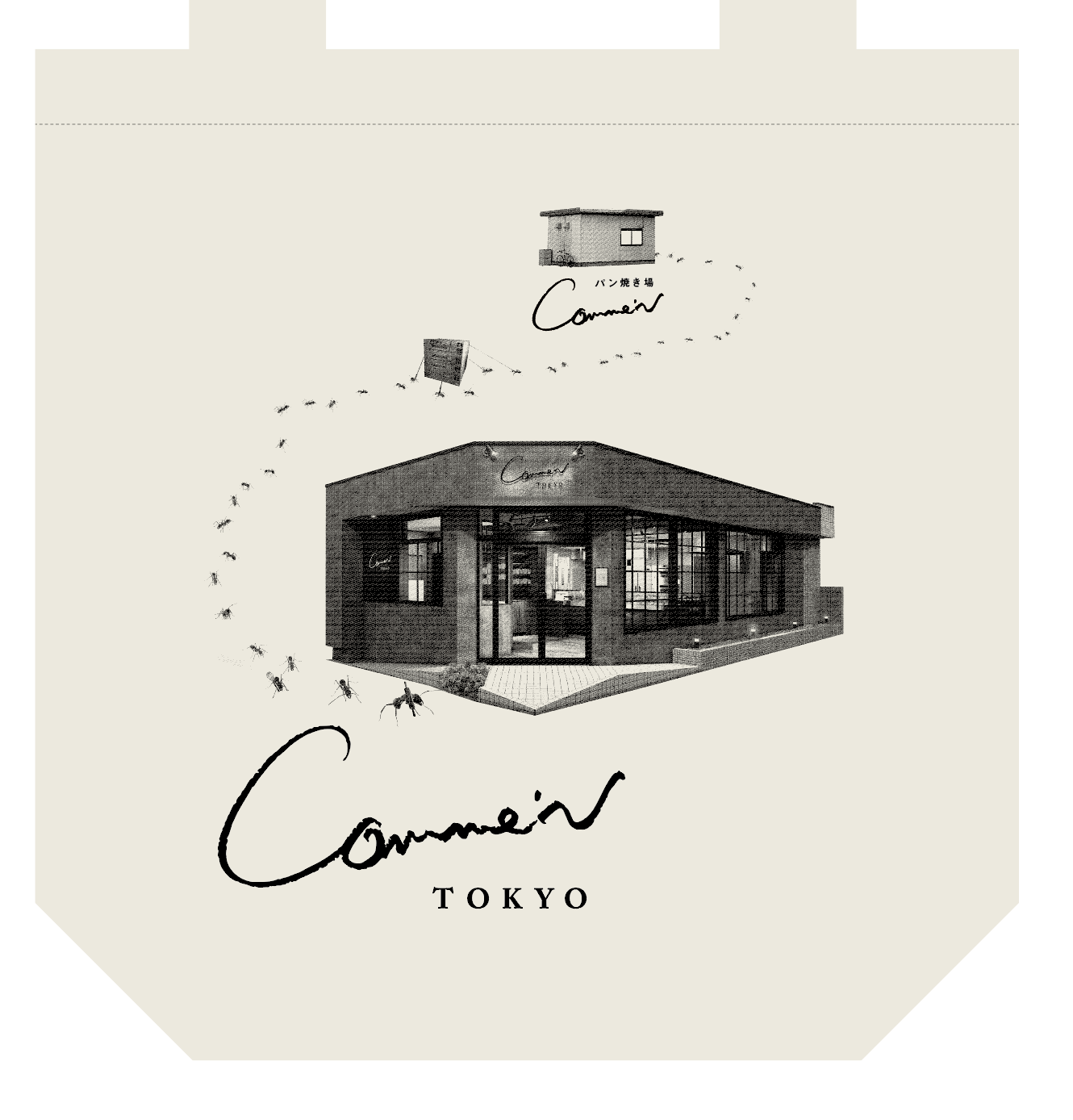 トートバックには、故郷・高崎のプレハブ小屋からスタートしたComme’Nが世界に認められ、そして東京へと歩んできたその軌跡をイメージ。働きアリのようにいつもと変わらず、コツコツとパンに向き合ってきた大澤シェフの姿勢も表現しています。
