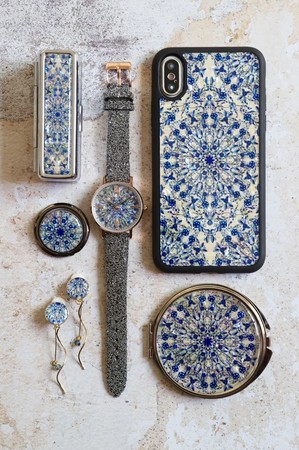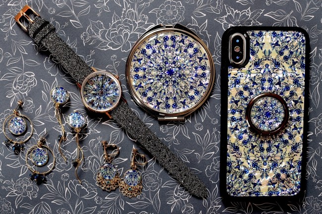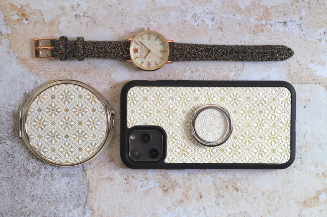 他にもフラワーファンタジー・花菱・モロッコタイル・ダマスク・マジョリカ・鞠・星のかけらとPrint criativeのスマホケース等で人気のデザインを文字盤に採用した美しく、かわいい螺鈿アートウォッチもお選びいただけます。