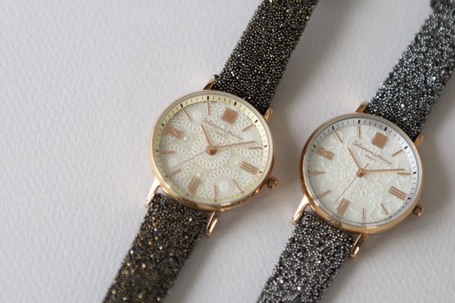 腕時計は文字盤に螺鈿アートを採用し、ストラップはスワロフスキー®︎ファブリックで仕立てた特別仕様です。