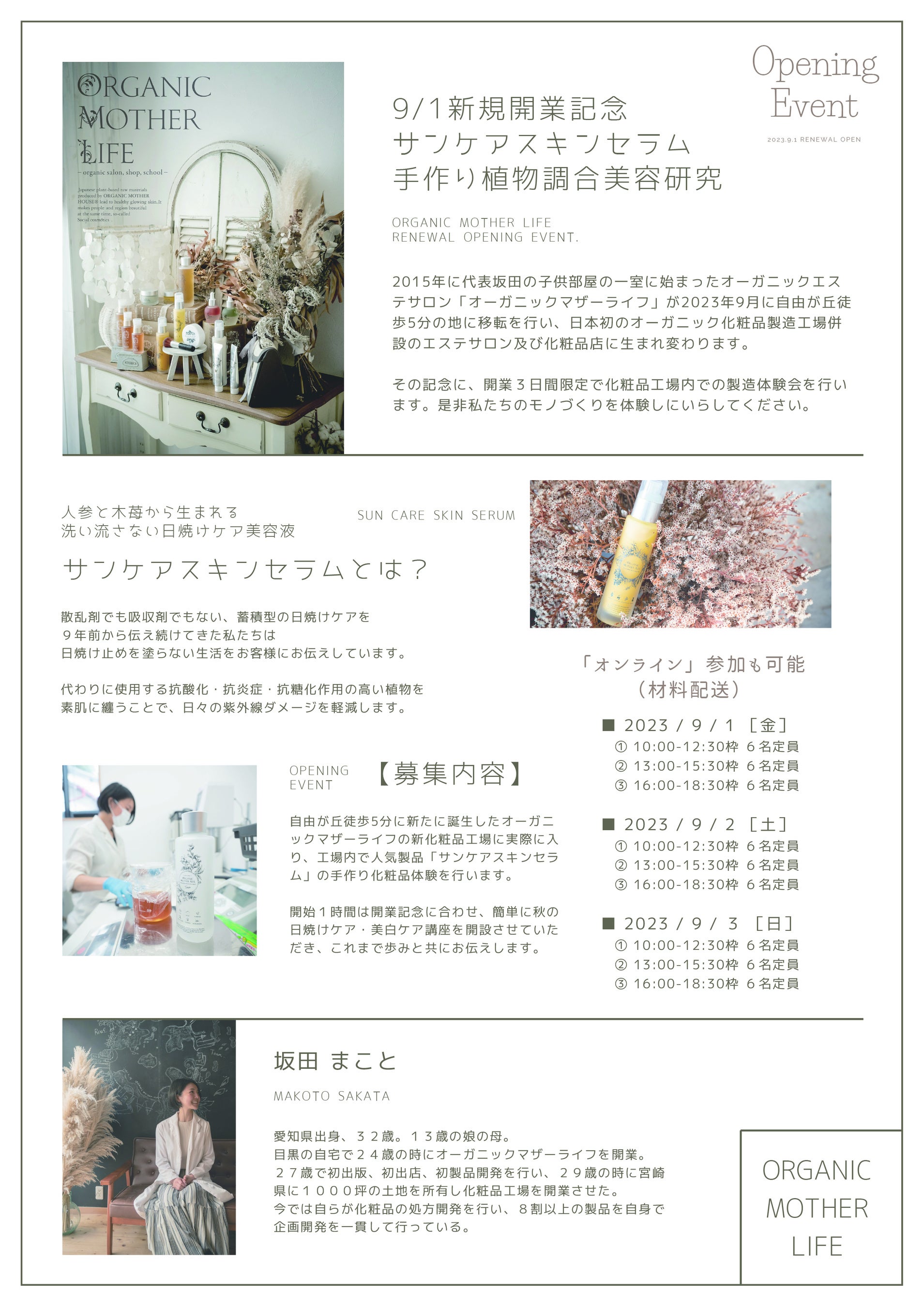 当店は隣町である緑が丘駅に2018年より運営を開始した「ORGANIC MOTHER LIFE」のリニューアルオープン(移転)であり、代表の坂田まこと自らが開発処方、そして研究を行う「オーガニックマザーライフ化粧品」(他8ブランド)の旗艦店となります。