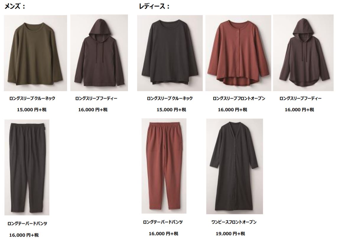 レディース:ロングスリーブクルーネック、ロングスリーブフロントオープン、ロングスリーブフーディー、ロングテーパードパンツ、ワンピースフロントオープン