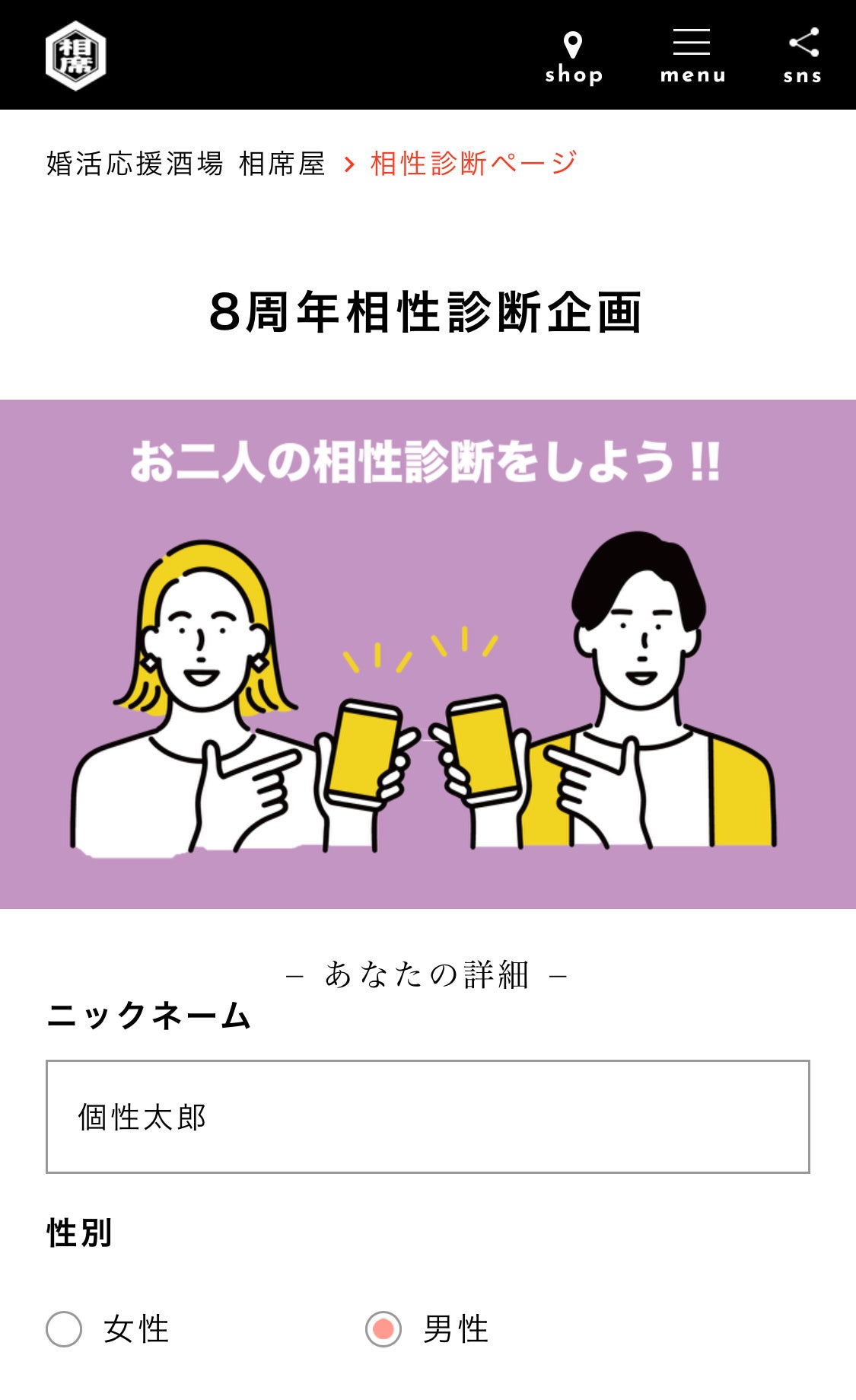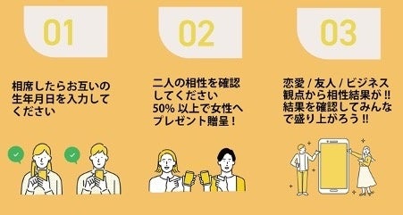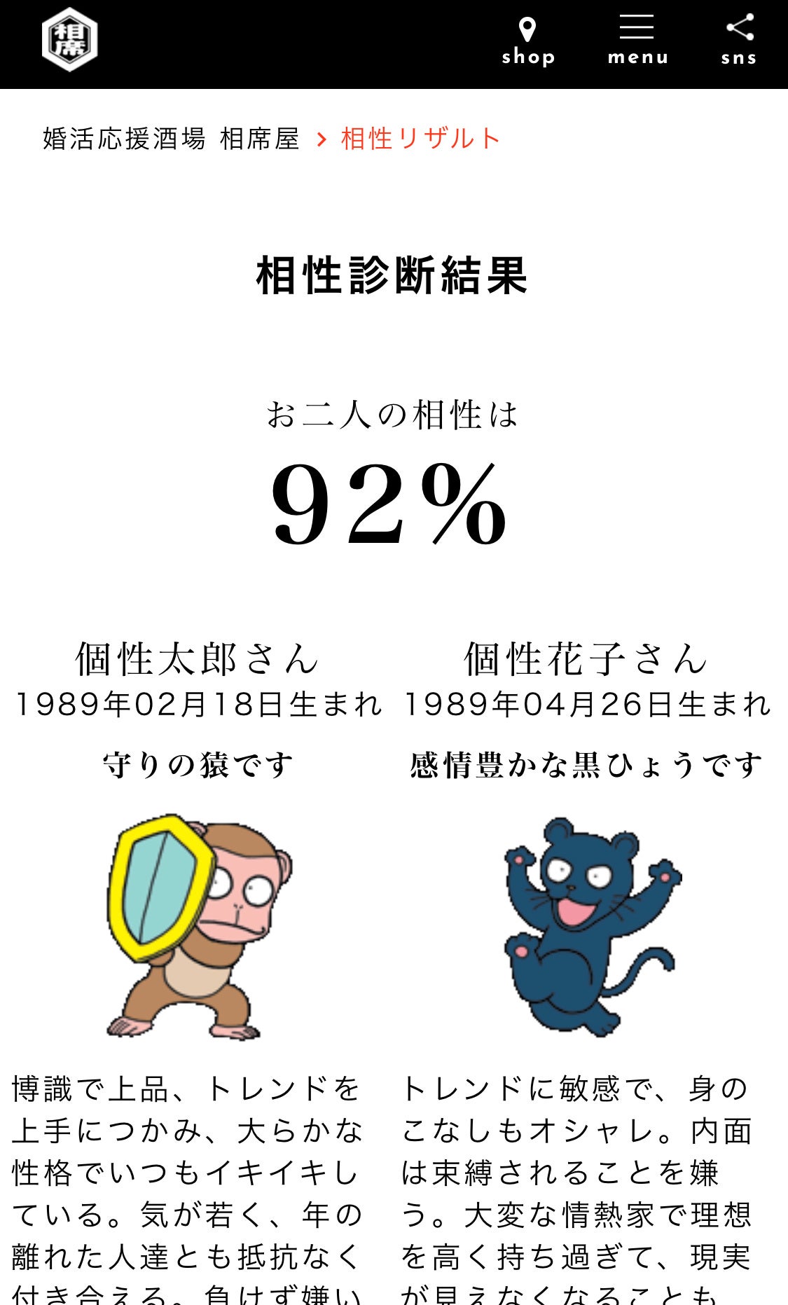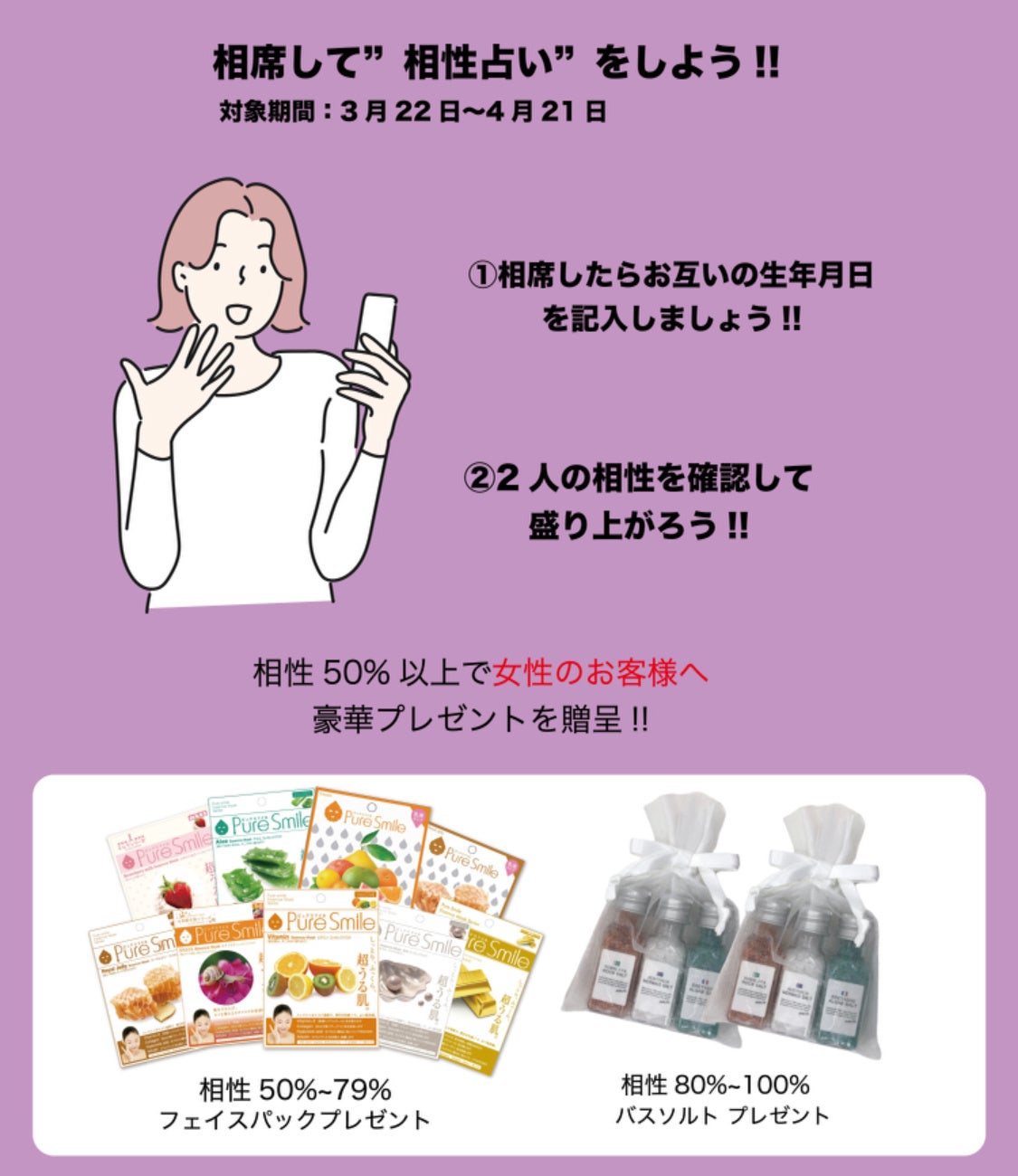 今回、生年月日を利用した動物キャラナビ診断によって、相席相手と相性診断をすることができます。相性が50%以上の場合、フェイスパックやバスソルトセットなどのノベルティをプレゼント致します。また、相席屋をご利用いただいたお客様は、退店後に弊社の個別の性格診断が受けられるようになっています。