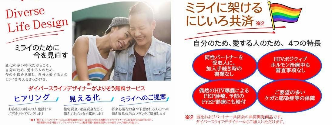 パートナー共済会(所在地:東京都新宿区、代表理事:小吹文紀)と、パートナー共済の募集・管理・運営業務を委託している株式会社ダイバースパートナーズ(所在地:東京都新宿区、代表取締役:足立哲真)および総合保険代理店R&C株式会社(所在地:東京都港区、代表取締役:足立哲真)は、中部電力ミライズコネクト株式会社(所在地:愛知県名古屋市中区、代表取締役:秋山光輝)と共同で、お金とほけんの無料相談サービス「ダイバースライフデザインサービス」と新総合保障共済「ミライに架けるにじいろ共済」を開発し、名古屋レインボープライド(2022年5月14日、於:名古屋市東区オアシス21銀河の広場)の開催に合わせ、2022年5月13日(金)からその提供を開始したことをお知らせいたします。