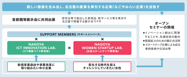 中小企業や女性起業家を対象に、イノベーション活動による新商品・新サービス、新規事業創出を支援することで、新たな価値を生み出し、名古屋の産業を牽引する「なごやみらい企業」を目指すもの。