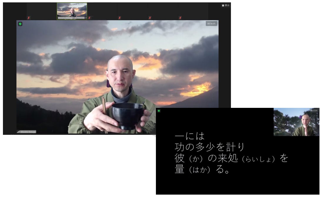 ― 朝昼晩・各1時間×3回オンライン集合、お粥を食し(晩は無し)、坐禅と法話