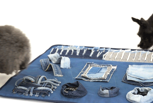 仕掛けられたデニムのマットで、愛犬が生き生き遊ぶ