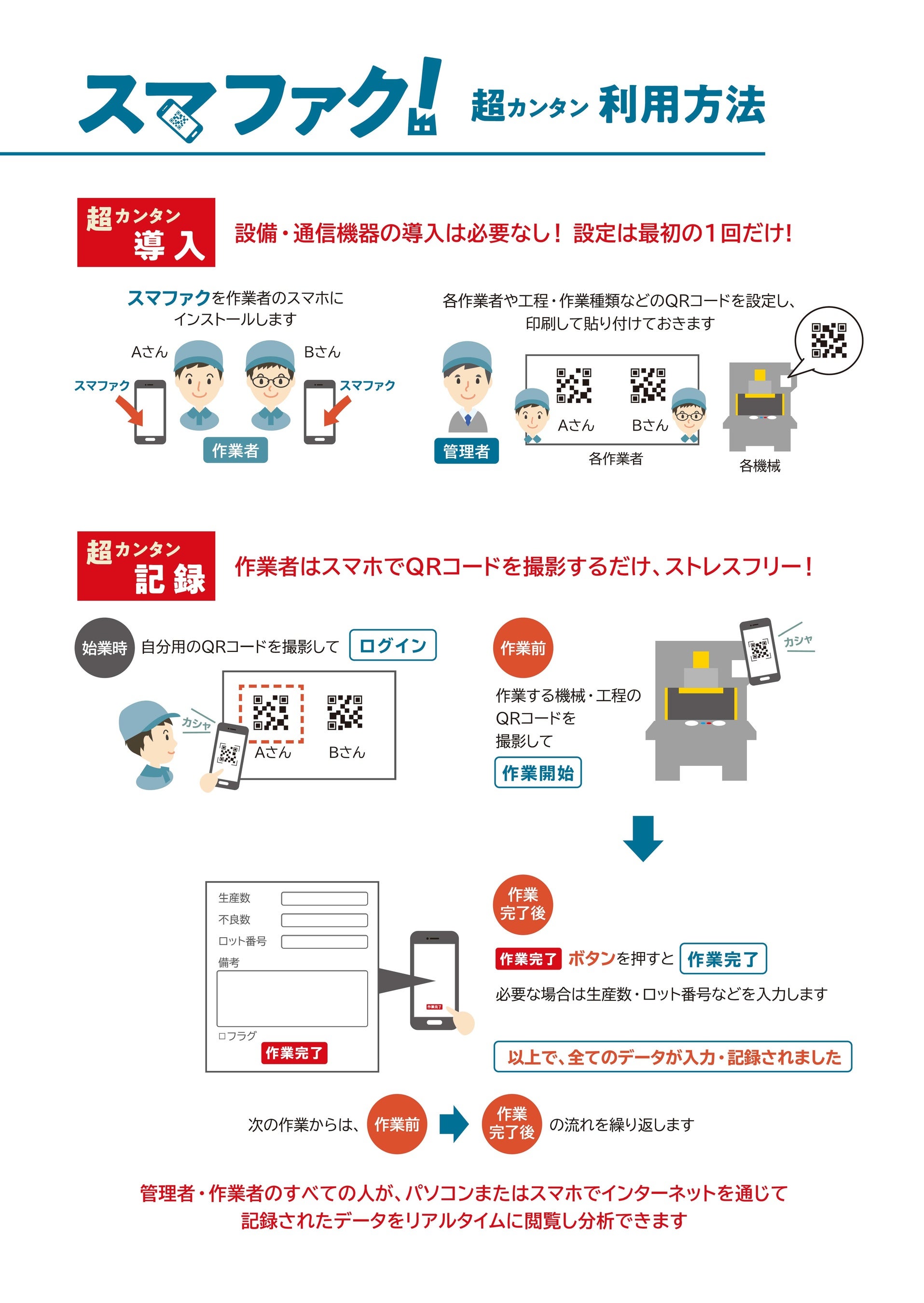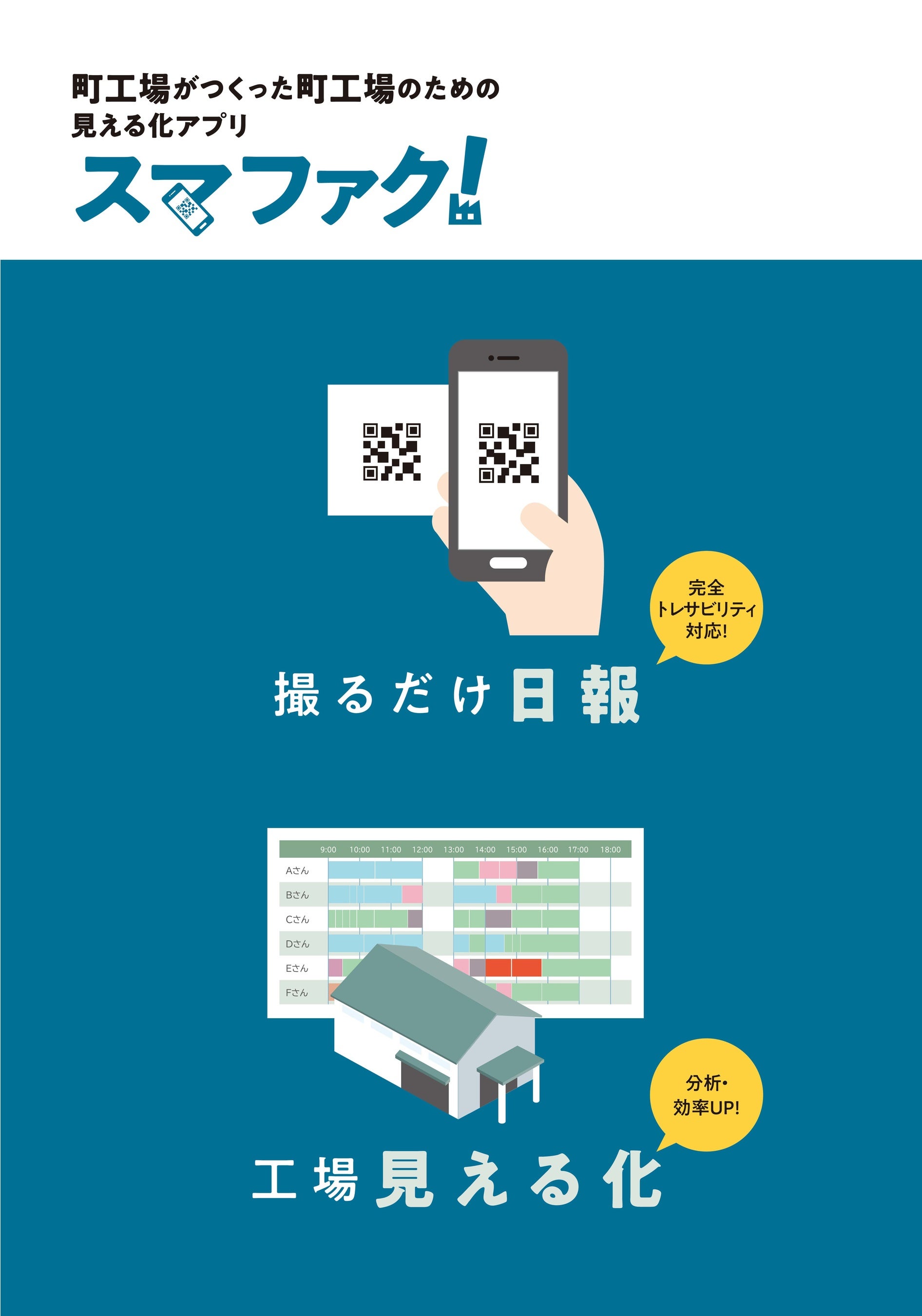 製造現場において必須記録帳票である作業日報を、簡単にデジタル化できるアプリが 「スマファク!」です。“QRコード・スマホ撮るだけ記録”で行動・作業の内容が記録され、記録されたデータはクラウド上で更新管理、いつ・どこからでもPC・スマホ・ダブレットで確認可能です。データ取得でDX経営を目指す全てのモノづくり企業にオススメするクラウド・サービスです。