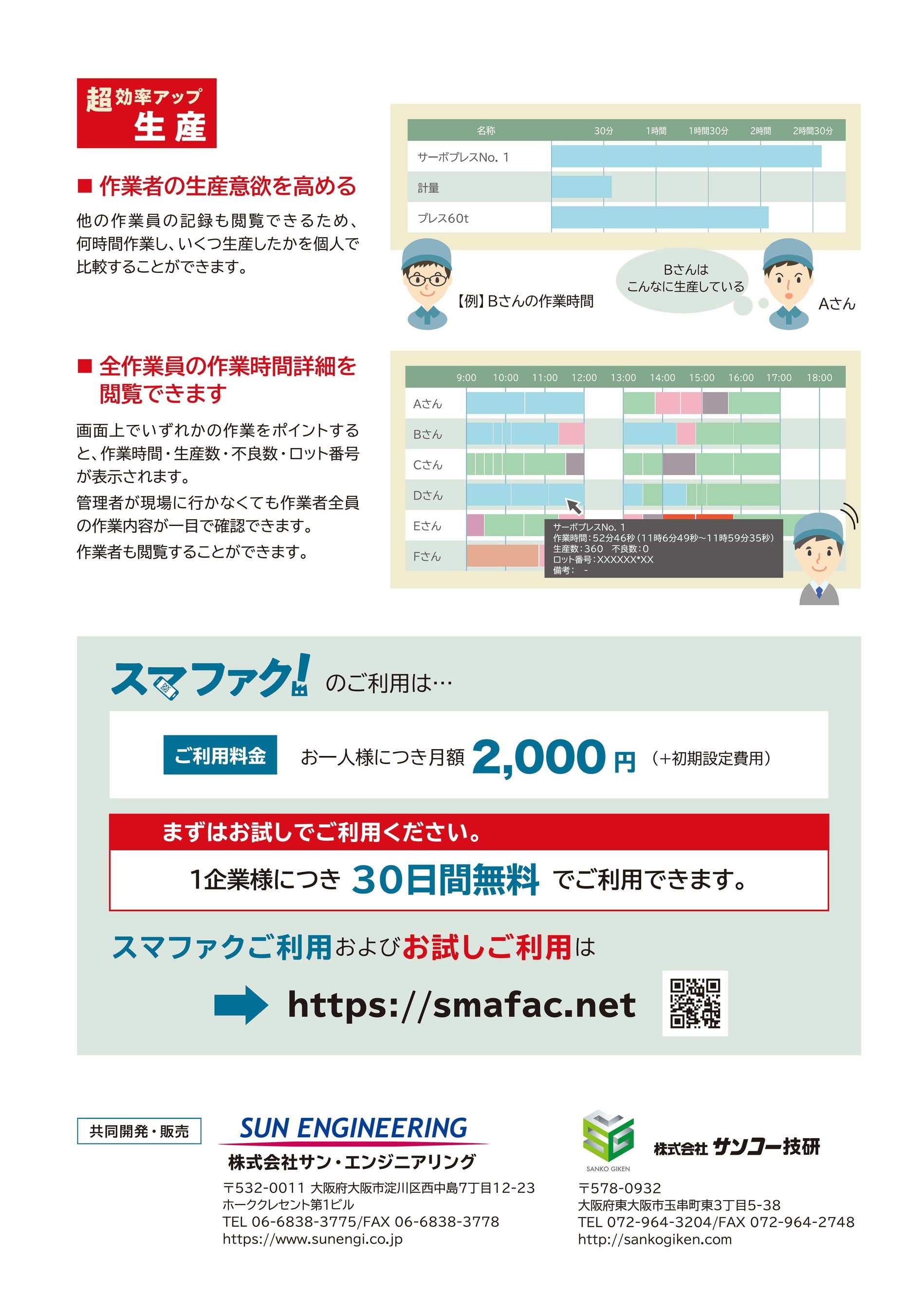 株式会社サンコー技研(東大阪市)は、製造現場で必須の作業日報記録を、作業者の負担を極限まで下げることにこだわった“QRスマホ撮るだけ操作”の簡便性により、日報デジタル化を定着実現させるスマホアプリ『スマファク!』を、2020年4月よりIoTメーカー(株)サン・エンジニアリング(大阪市)と協業販売を続けている。