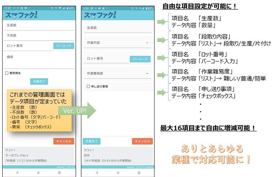 事前にPCで名称設定・印刷したQRコードを現場掲示し、作業する名称毎のQRを作業開始時にスマホカメラで読み取るだけでデータが記録開始、作業終了時にはスマホアプリ画面にある【作業完了ボタン】を押せば記録が完了。これをシンプルに繰り返すことで、忙しい現場でも簡単に記録ができるシステムとなっている。今回のアップデートでは、デフォルト設定されていた5つの記録可能なデータ項目が、自由に項目変更・追加減が可能となるバージョンアップとなっており、各顧客の要望に沿ったきめ細かい設定が実現することとなる。