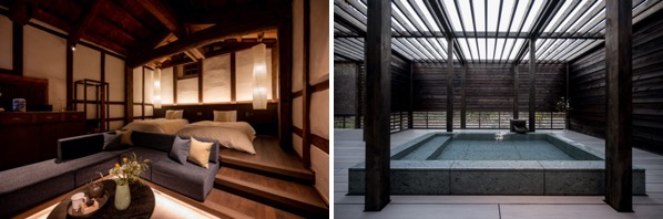 他の蔵2棟は、各々が一棟貸の客室としてご宿泊でき、庭には土肥温泉がかけ流しされる露天風呂を備え、江戸時代から残る蔵の重厚感ある空間を楽しむことができます。