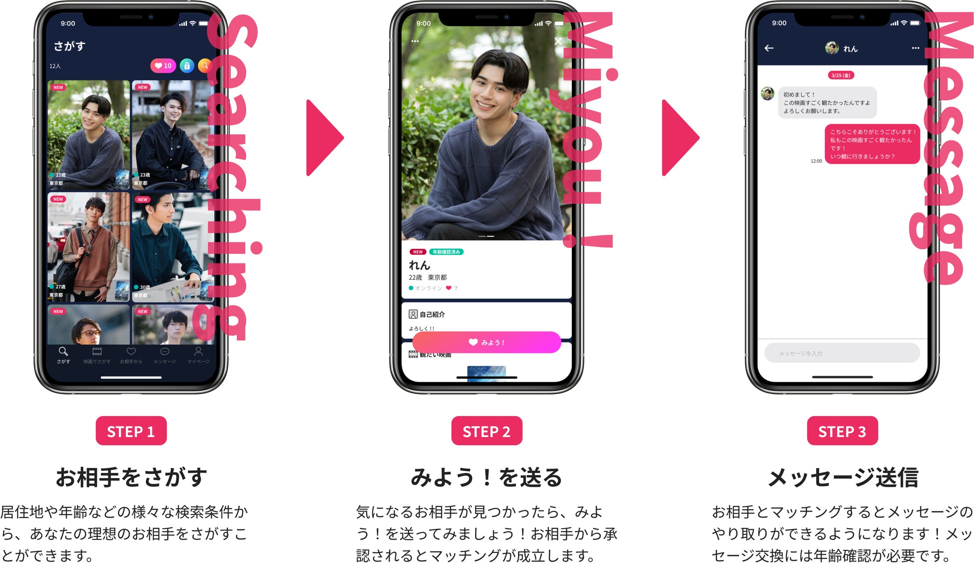Miyouは、初めて会う人とのデートプランを考える負荷を減らします。どこの映画館なのかを決めるだけで、周囲のお店も調べやすいし、待ち合わせも映画館近くでOKです。デートをすることに慣れていない人でも、相手をスムーズにエスコートできます。もしもミスマッチをしてしまった場合も、最低限の時間と最低限のコミュニケーションだけでお別れすることもできます。また、映画館はショッピングモールなど人が行き交う場所にあるため、女性も安心してデートに臨めるし、男性も心理的な抵抗が少ない状態で女性をお誘いすることができます。ユーザーの負荷を最小限に減らし、たくさんの人々の出会いに繋がる架け橋になれたらと考えています。