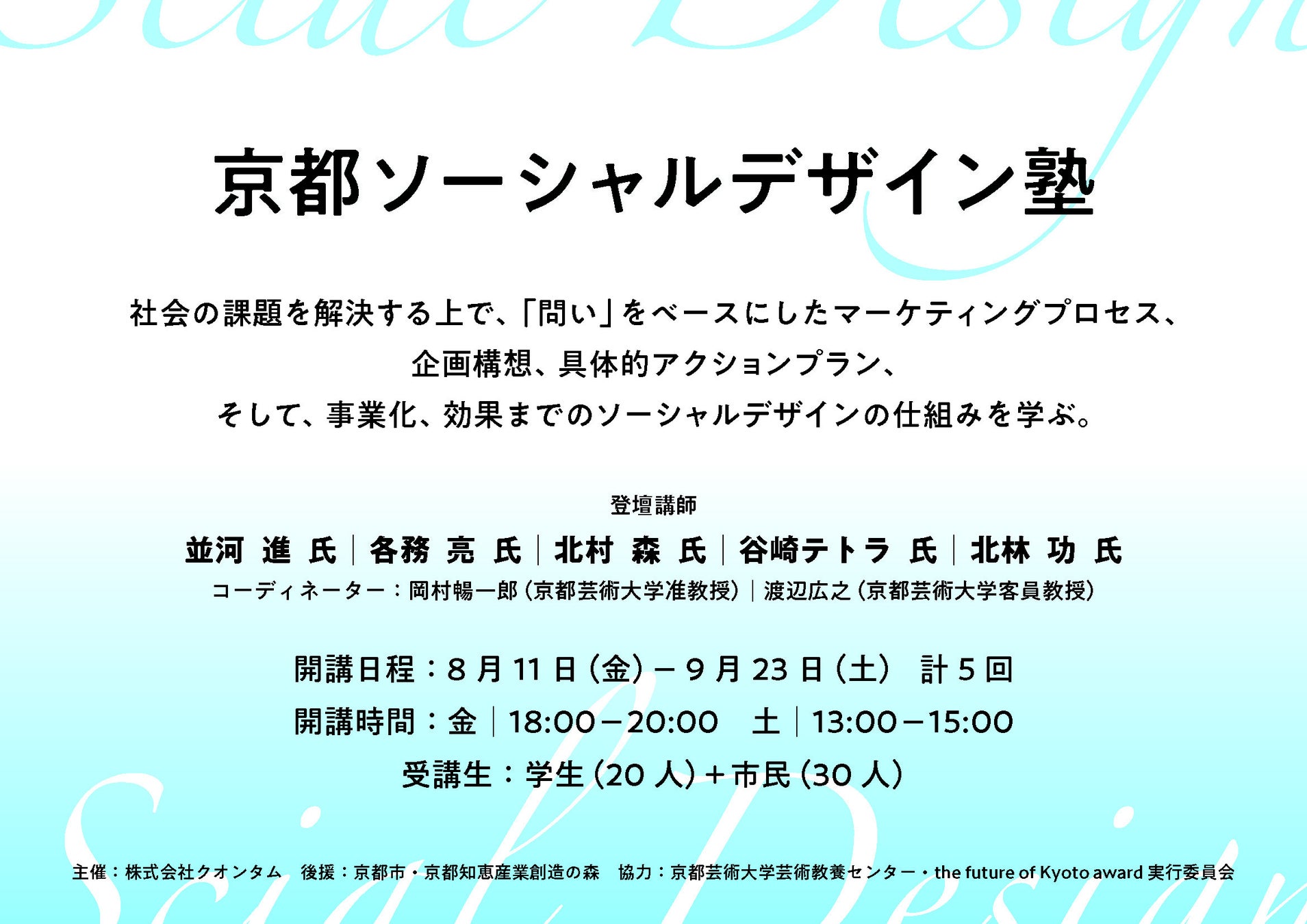 京都を舞台に社会課題の解決を考える京都ソーシャルデザイン塾(5回完結)がスタートします(8/11・8/19・9/1・9/15・9/22)。