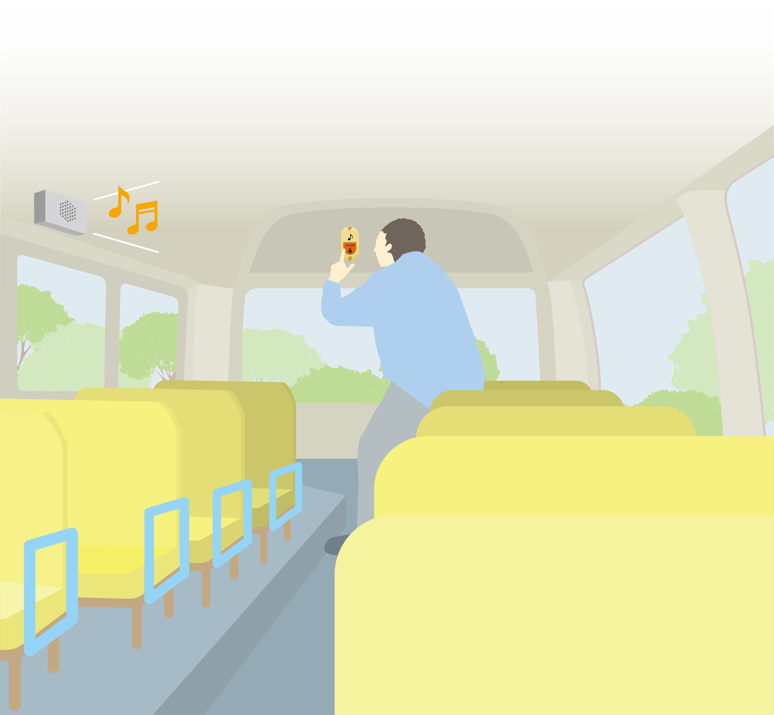 本装置は、エンジン停止後にチャイムが鳴り、車内後部などに設置した押しボタンを押すことでチャイムが止まる仕組みにより、乗務員に車内確認を促す装置です。無線式の押しボタンであるため、配線工事が不要であり既存車両への後付けが容易です。また、電池レス設計のため電池交換が不要であり、運用負担が軽減できます。当社は、押しボタンでは、国内シェア約30%の販売実績があります。