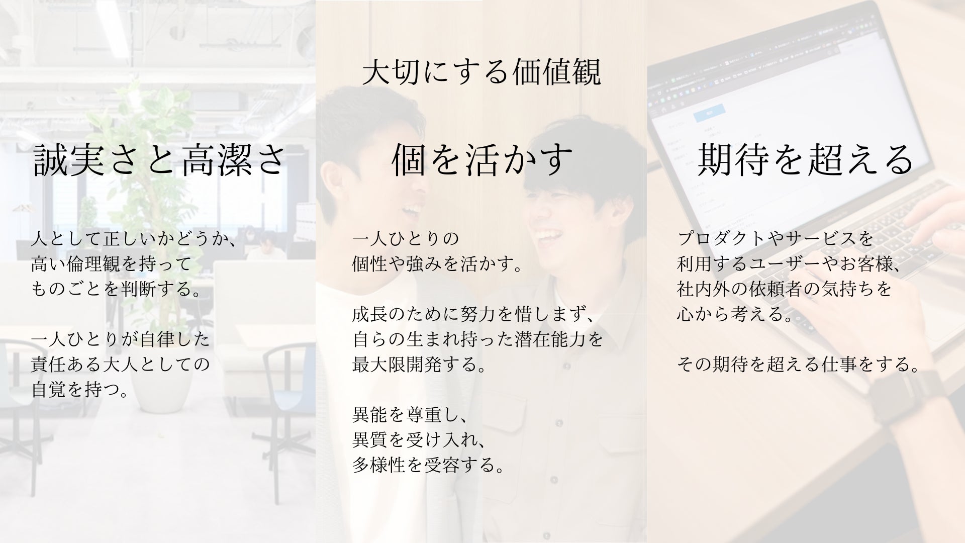 プロダクトやサービスを利用するユーザーやお客様、社内外の依頼者の気持ちを心から考える。その期待を超える仕事をする。