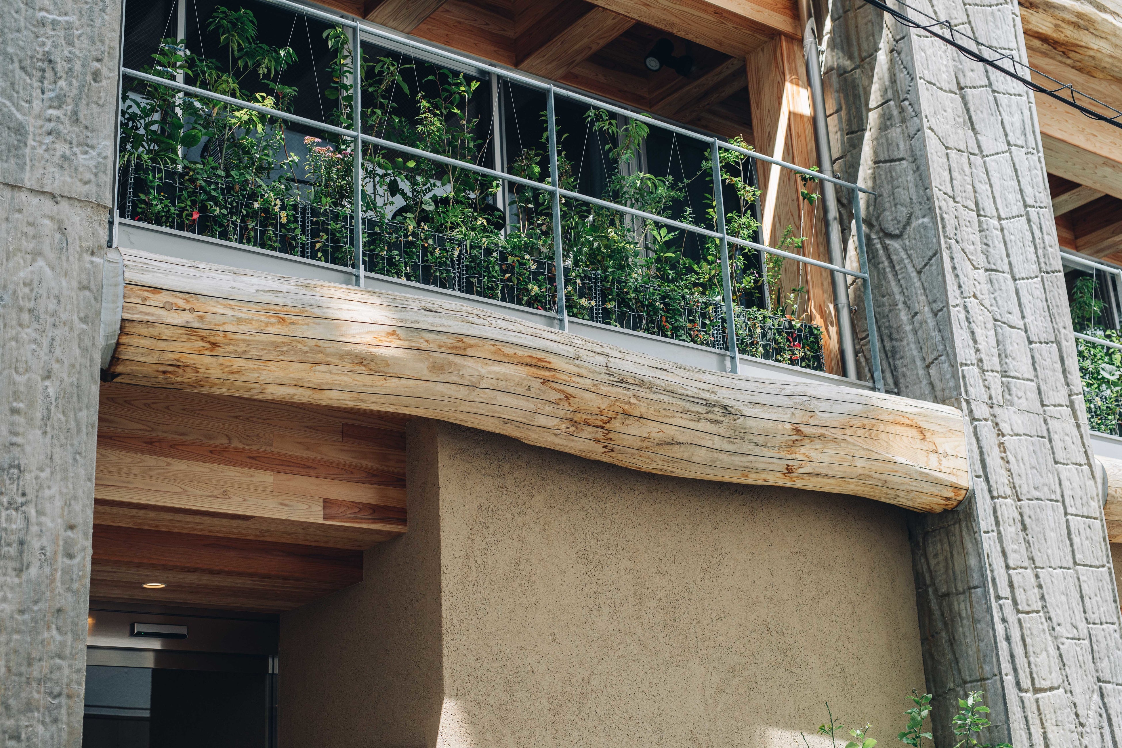 また、エントランス部分を含む1〜3階部分の梁には、秋田県産の栗の木を丸太のまま使用。通常、広葉樹の天然乾燥には数年の期間が必要とされますが、改質水と抗火石を使った日本初の木材乾燥機「woodbe(ウッドビー)」を用いて人工乾燥させることで、乾燥期間の大幅な圧縮とコスト削減が実現しました。