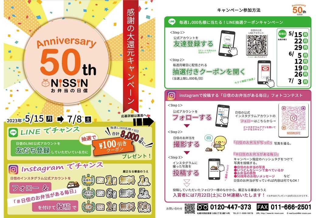 【創業50周年記念!】札幌のお弁当メーカー「日信」が、2023年5月15日(月)~7月8日(土)の期間で、最大8,000名以上の方が当選する感謝の大還元キャンペーンを開催!