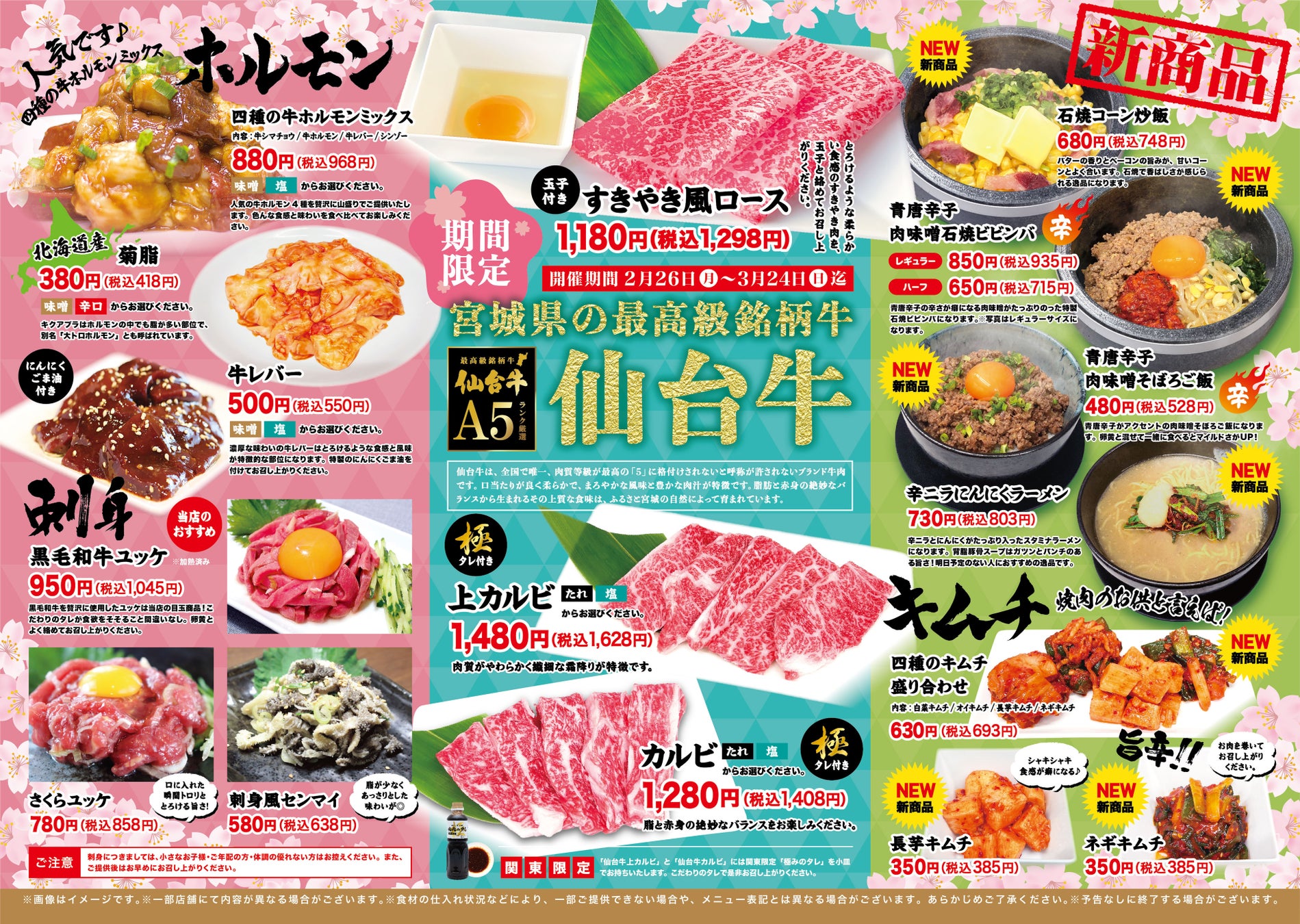焼肉スエヒロ館では、2024年2月26日(月)から期間限定でおすすめメニューの販売を開始いたします。大好評販売中のA5ランク仙台牛も引き続きご堪能いただける他、新商品も続々と登場しております。是非、この機会にご堪能ください。