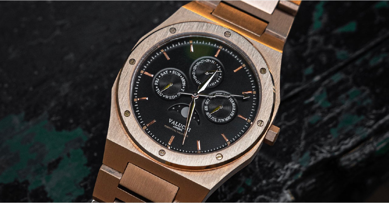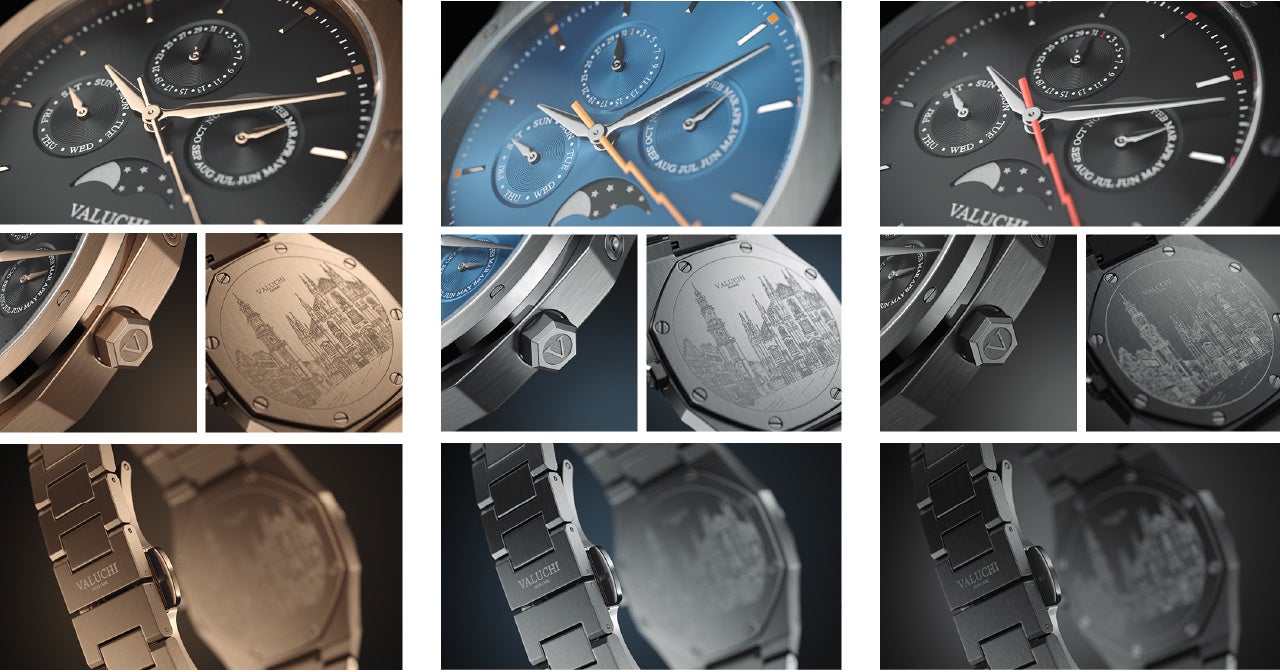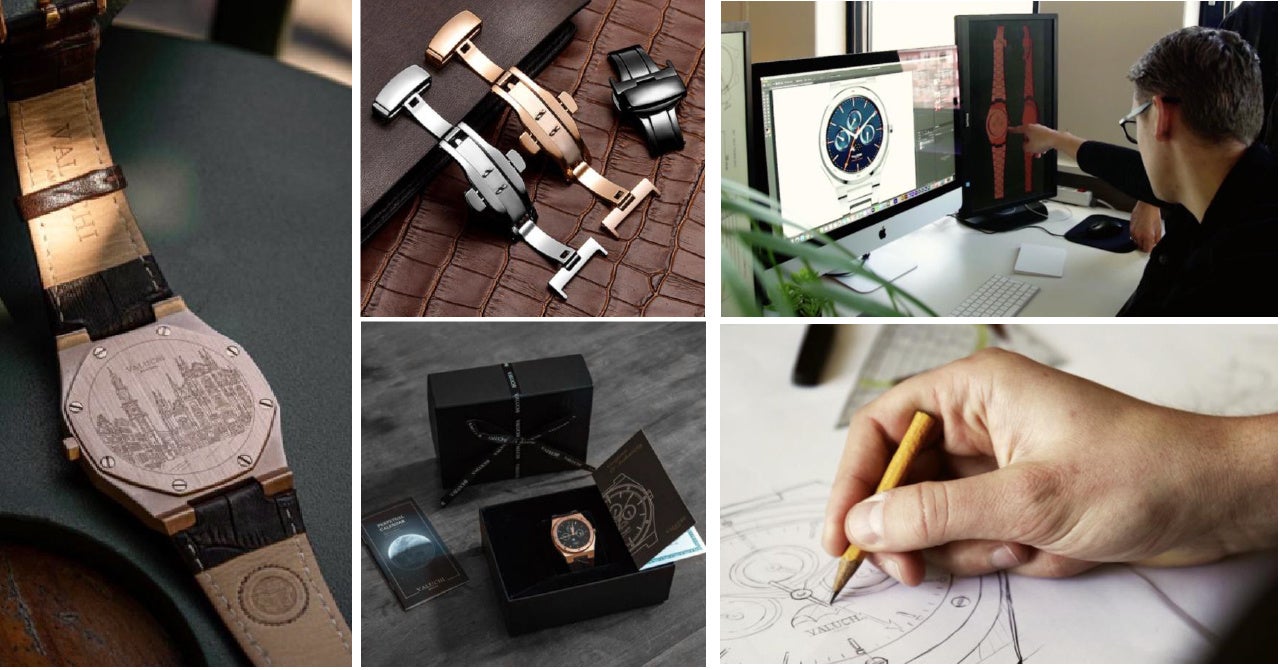 Valuchiは上位の時計メーカーと提携して、職人が高度な技術を駆使しています。職人技のノウハウ、信頼性、模範的な仕上げを使用して、細部に注意を払って組み立てられています。