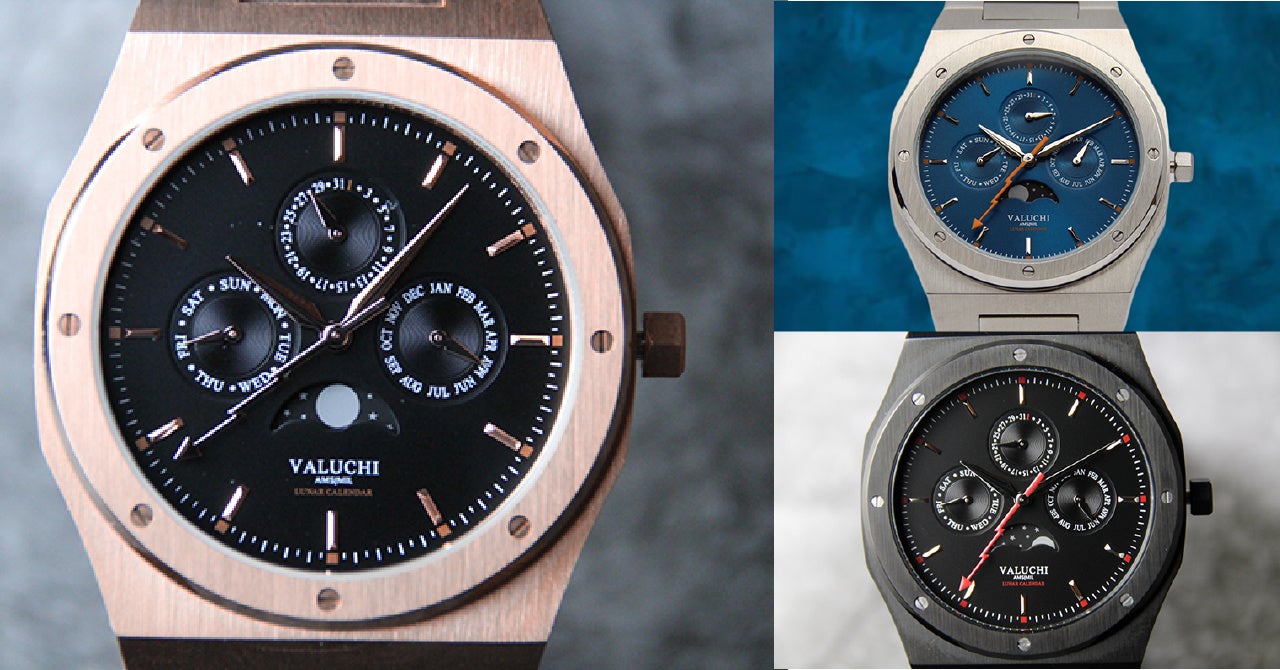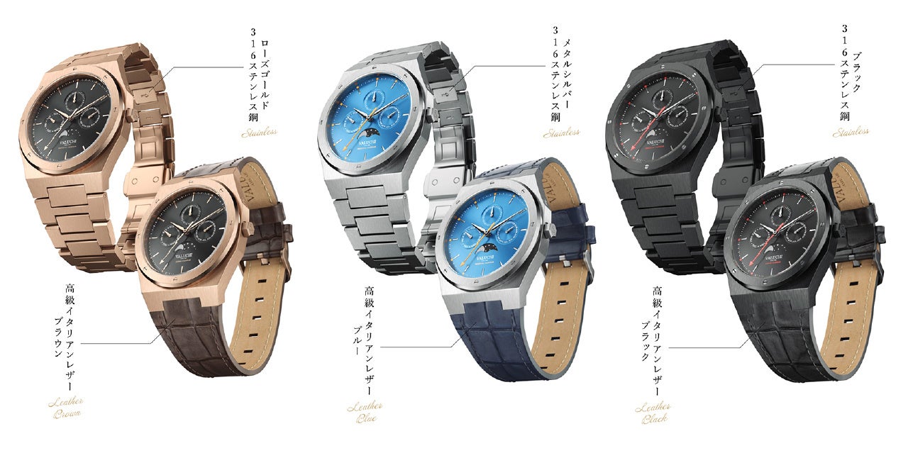 かつては高級腕時計を象徴する複雑機構であったムーンフェイズですが、今回のプロジェクトではムーンフェイズ&パーペチュアルカレンダー風のトリプルカレンダー機能が付いた腕時計を、リーズナブルな価格でお手に取っていただき、ファッションの街、ミラノとアムステルダムの風を感じられる上質感を、日本の皆様にも気軽に味わっていただきたい、というコンセプトのプロジェクトになります。