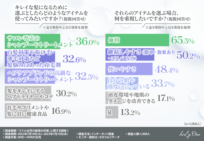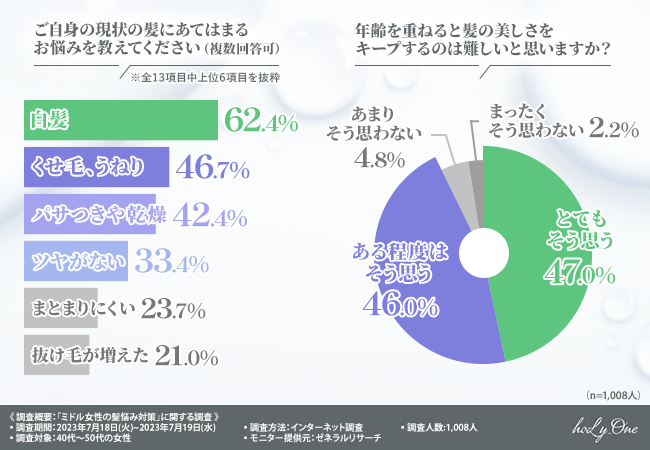 そこで、パーソナライズ頭皮ケア『hoLy_One(ホーリーワン)』(https://www.holy-one.jp/)を運営する株式会社アクアネットは、40代~50代の女性を対象に、「ミドル女性の髪悩み対策」に関する調査を実施しました。